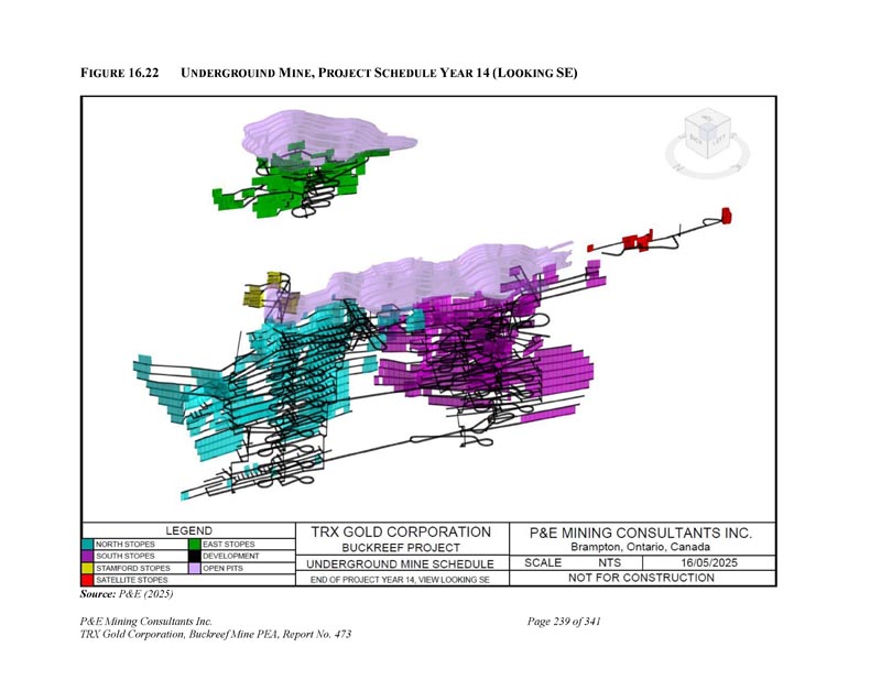 F IGURE 16.22 U NDERGROUIN M INE,P ROJECT S CHEDULE Y EAR 14(L OOKING SE)资料来源:P & E(2025)P & E Mining Consultants Inc. TRX Gold Corporation,Buckreef Mine PEA,第473号报告,共341页第239