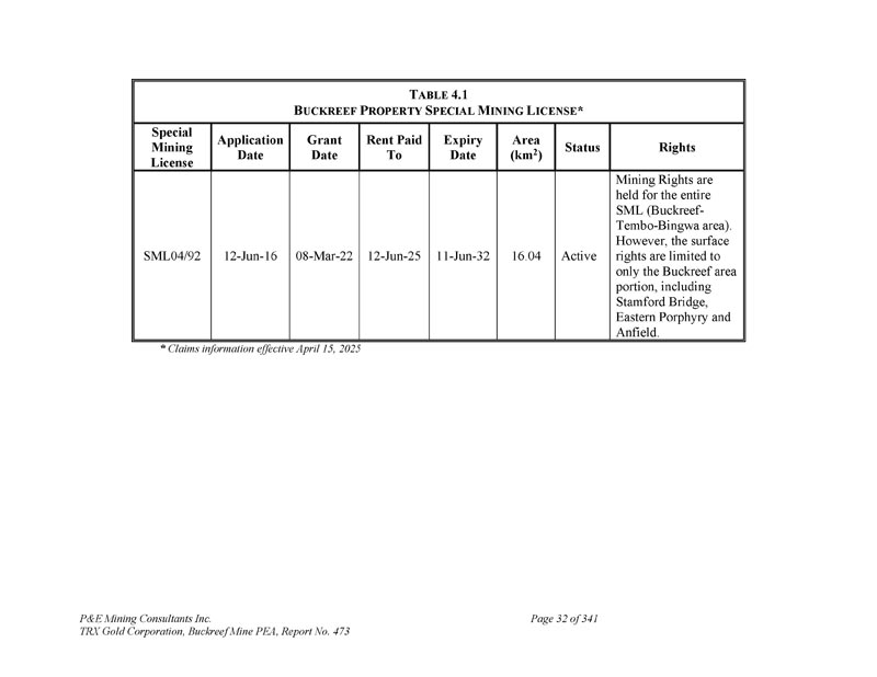 P & E Mining Consultants Inc. TRX Gold Corporation,Buckreef Mine PEA,Report No. 473第32页of 341 t ABLE 4.1 b UCKREEF P ROPERTY S PECIAL M INing L ICENSE*权利状态区域(km 2)到期日支付的租金授予日期申请日期特殊采矿许可证采矿权为整个SML(Buckreef-Tembo-Bingwa地区)持有。然而,地表权利仅限于Buckreef地区部分,包括斯坦福桥、东部斑岩和安菲尔德。活跃16.04 11-Jun-32 12-Jun-25 08-Mar22 12-Jun-16 SML04/92*理赔资料自2025年4月15日起生效