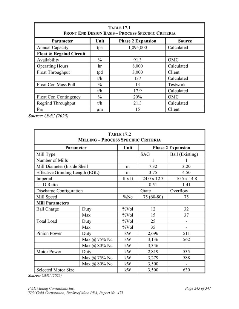 P & E Mining Consultants Inc. TRX Gold Corporation,Buckreef Mine PEA,第473号报告第245页,共341吨ABLE 17.1 F RONT E ND D ESIGN B ASIS – P ROCESS S PECIFIC C RITERIA Source Phase 2扩展单元参数计算1,095,000 tpa年产能浮法&再磨电路OMC 91.3%可用性计算8,000 hr工作小时客户端3,000 tpd浮法吞吐量计算137 t/h测试工作13%浮法质量拉力计算17.9 t/h OMC 20%%浮法应急计算21.3 t/h再磨吞吐量客户端15 μ m P 80来源:OMC(2025)T ABLE 17.2 m ILING – P ROCESS S PECIFIC C RITERIA Phase 2膨胀单元参数球体(现有)SAG磨机类型11磨机数3.207.32 m磨机直径(内壳4.50 3.75 m有效磨长(EGL)10.5 x 14.82 4.0x 12.3 ft x ft Imperial 1.4 10.51 L:D比溢流式炉排出配置7575(60-80)% NC磨机速度磨机参数3212% Vol-Duty Ball Charge 3715% VolMax-25% Vol-Duty Total Load-35% Vol-Max 5112,696 kW Duty Pinion Power 5623,136 kW Max @75% NC-3,346 kW Max @80% NC 5352,819kW占空电机功率5883,279 kW Max @75% NC-3,500 kW Max @80% NC 6303,500 kW选定电机尺寸来源:OMC(2025)