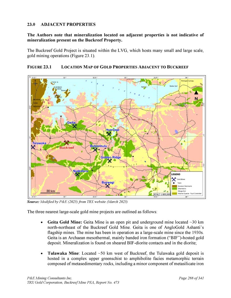 23.0邻接属性作者指出,位于相邻属性上的矿化并不表明存在于Buckreef属性上的矿化。Buckreef黄金项目位于LVG内,该项目承载着许多小型和大型金矿开采业务(图23.1)。F IGURE 23.1 L OCATION M AP of G OLD P ROPERTIES A DJACENT to B UCKREEF来源:由P & E(2025)修改自TRX网站(2025年3月)最近的三个大型金矿项目概述如下:Geita金矿:Geita矿是一个露天和地下矿山,位于Buckreef金矿以北-东北方向~30公里处。Geita是AngloGold Ashanti的旗舰矿山之一。该矿山自1930年代以来一直作为大型矿山运营。盖塔为太古代中温、主要为带状铁层(“BIF”)为主的金矿。在剪切的BIF-闪长岩触点上以及闪长岩中发现了矿化作用;Tulawaka矿:Tulawaka金矿位于Buckreef以西~50公里处,位于由变沉积岩组成的复杂的上绿片岩到角闪岩相变质地形中,其中包括偏硅酸铁P & E Mining Consultants Inc.的一个微量组分。丨TRX Gold Corporation,Buckreef矿PEA,报告编号:473,共341页288