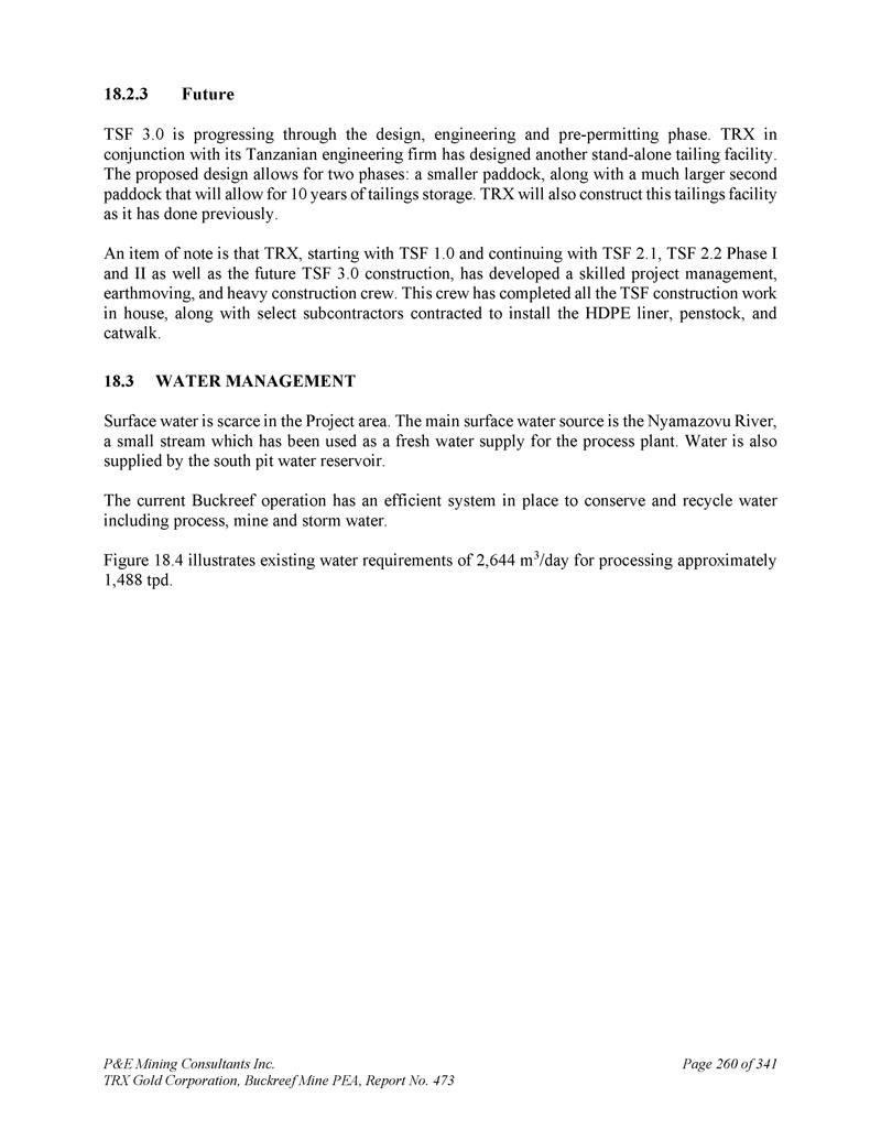P & E Mining Consultants Inc. TRX Gold Corporation,Buckreef Mine PEA,Report No.473 page 260 of 34118.2.3 Future TSF3。0正在通过设计、工程和预许可阶段进行中。TRX与其坦桑尼亚工程公司合作设计了另一个独立的尾矿设施。拟议的设计允许两个阶段:一个更小的围场,以及一个大得多的第二个围场,这将允许10年的尾矿储存。TRX也将像以前一样建造这座尾矿设施。需要注意的是,TRX,以TSF1开头。0并继续TSF2。1、TSF2。2期I、II期以及未来的TSF 3。0施工,培养了一支熟练的工程管理、土方作业、重型施工人员。这个工作人员已经在内部完成了所有TSF建设工作,还有选定的分包商签约安装HDPE衬板、压力管和走秀。18.3水管理项目区域地表水稀缺。主要的地表水源是Nyamazovu河,这是一条已被用作加工厂淡水供应的小溪。南坑水库也供水。目前的Buckreef行动有一个高效系统到位,以养护和回收水,包括过程水、矿井水和雨水。图18。4说明现有的水需求为2,644米3/天,用于处理大约1,488吨/天。
