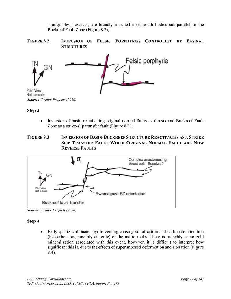 然而,地层学,均为Buckreef断裂带下平行的广泛侵入的南北天体(图8.2);B ASINAL S构造展开的F ELSIC P ORPHYRIES C的F IGURE 8.2 I NTRUSE来源:Virimai Projects(2020)Step 3盆地反演将原正断层重新活化为逆冲和Buckreef断裂带作为走向滑移转移断层(图8.3);B ASIN的F IGURE 8.3 I NVERSION-B UCKREEF S TRUCTURE R EactivATES作为A S TRIKE S LIP T RANSFER F AULT W HILE O RIGINAL N ORMAL F AULT ARE N OW R EVERSE F AULTS资料来源:Virimai Projects(2020)Step 4早期石英-碳酸盐硫铁矿脉络导致镁铁质岩石的硅化和碳酸盐蚀变(Fe碳酸盐,可能是铁石岩)。可能有一些金矿化与这一事件有关,然而,由于叠加变形和蚀变的影响,很难解释这有多重要(图8。4);P & E Mining Consultants Inc. TRX Gold Corporation,Buckreef Mine PEA,报告第473页,共341页
