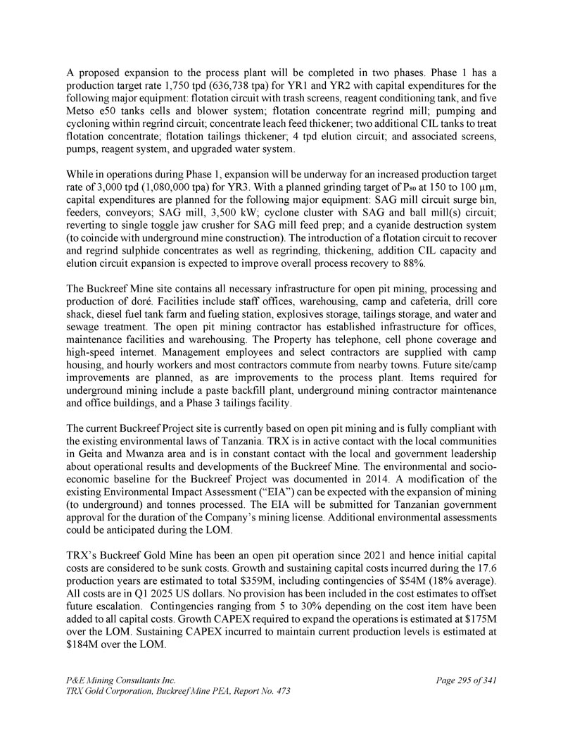 P & E Mining Consultants Inc. TRX Gold Corporation,Buckreef Mine PEA,Report No. 473 page 295 of 341 A拟议扩建至加工厂将分两个阶段完成。Phase 1的生产目标率为1,YR1和YR2为750吨/日(636,738吨/年),资本支出用于以下主要设备:带垃圾桶的浮选回路、试剂调理池,以及五个美卓e-50罐槽单元和鼓风机系统;浮选精矿再研磨机;再研磨回路内的泵送和旋涡;精矿浸出给料浓缩机;增加两个用于处理浮选精矿的CIL罐;浮选尾矿浓缩机;4吨/日洗脱回路;以及相关的筛网、泵、试剂系统,以及升级后的水系统。在第1阶段运营期间,将进行扩建,以提高YR 3的产量目标率,即3000吨/日(1,080,000吨/年)。P规划粉磨目标为150~100 μ m,资本支出计划用于以下主要设备:SAG磨机电路调压箱、给料机、输送机;SAG磨机,3,500kW;带SAG和球磨机(s)电路的旋风簇;恢复为SAG磨机进料准备的单拨动颚式破碎机;以及氰化物销毁系统(以配合地下矿山建设)。引入浮选回路以回收和再研磨硫化物精矿以及重新研磨、增稠、添加CIL容量和洗脱回路扩建,预计可将整体工艺回收率提高至88%。Buckreef矿址包含露天开采、加工和生产dor é的所有必要基础设施。设施包括员工办公室、仓储、营地和自助餐厅、钻芯小屋、柴油油箱农场和加油站、炸药储存、尾矿储存以及水和污水处理。露天采矿承包商建立了办公室、维修设施和仓储的基础设施。物业有电话、手机覆盖、高速互联网。向管理员工和选定的承包商提供营地住房,小时工和大多数承包商从附近的城镇通勤。计划对未来的场地/营地进行改进,对工艺工厂的改进也是如此。地下采矿所需项目包括浆料回填厂、地下采矿承包商维修和办公楼,以及3期尾矿设施。目前的Buckreef项目场地目前以露天采矿为基础,完全符合坦桑尼亚现有的环境法。TRX积极与Geita和Mwanza地区的当地社区保持联系,并就Buckreef矿的运营结果和发展与当地和政府领导层保持不断联系。Buckreef项目的环境和社会经济基线记录于2014年。随着采矿(向地下)和加工吨数的扩大,可以预期对现有环境影响评估(“环评”)进行修改。该环境影响评估将在公司采矿许可证有效期内提交坦桑尼亚政府批准。预计将在LOM期间进行更多的环境评估。TRX的Buckreef金矿自2021年以来一直是露天开采,因此初始资本成本被视为沉没成本。增长和维持资本成本在17日期间发生。6个生产年度估计总额为3.59亿美元,包括5400万美元的或有事项(平均18%)。所有成本均在Q12025美元。成本估算中没有包括任何拨备以抵消未来的升级。根据成本项目不同,5%到30%不等的或有事项已被添加到所有资本成本中。扩大业务所需的增长资本支出估计比LOM高出1.75亿美元。维持当前生产水平所产生的持续资本支出估计比LOM高出1.84亿美元。