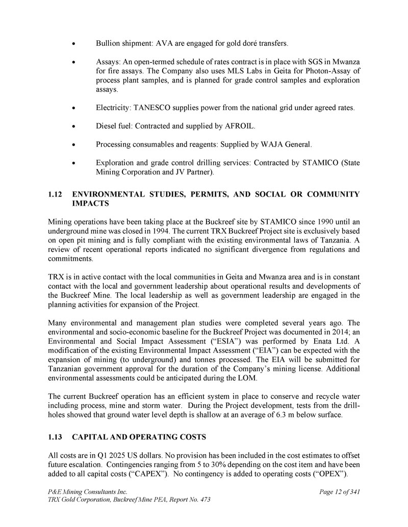 P & E Mining Consultants Inc. TRX Gold Corporation,Buckreef Mine PEA,Report No. 473 Page 12 of 341 Bullion shipping:AVA is engaged for gold dor é transfers。Assays:与Mwanza的SGS签订了一份开放式的费率时间表合同,用于火灾化验。该公司还使用Geita的MLS实验室进行工艺工厂样品的光子分析,并计划用于等级控制样品和勘探分析。电力:TANESCO根据议定费率从国家电网供电。柴油:由AFROIL承建及供应。加工耗材和试剂:由WAJA General提供。勘探和品位控制钻井服务:由STAMICO(国营矿业公司和合资伙伴)承包。12.环境研究、许可证以及社会或社区影响自1990年以来,STAMICO一直在Buckreef现场进行采矿作业,直到1994年一个地下矿山被关闭。目前的TRX Buckreef项目场地完全以露天采矿为基础,完全符合坦桑尼亚现有的环境法。对最近业务报告的审查表明,与法规和承诺没有显着差异。TRX与Geita和Mwanza地区的当地社区保持积极联系,并与当地和政府领导层就Buckreef矿的运营结果和发展保持不断联系。地方领导和政府领导都在参与项目扩建的规划活动。许多环境和管理计划研究在几年前就已完成。Buckreef项目的环境和社会经济基线于2014年记录在案;Enata Ltd.进行了环境和社会影响评估(“ESIA”)。随着采矿(向地下)和加工吨数的扩展,可以预期对现有环境影响评估(“环评”)进行修改。该环境影响评估将在公司采矿许可证有效期内提交坦桑尼亚政府批准。预计将在LOM期间进行更多的环境评估。目前的Buckreef行动有一个高效的系统到位,以养护和回收水,包括过程水、矿井水和雨水。在项目开发过程中,从钻孔进行的测试表明,地面水位深度较浅,平均为6。地表以下3米。13.资本和运营成本所有成本在Q12025美元。成本估算中没有包括任何拨备以抵消未来的升级。根据成本项目的不同,5%至30%不等的或有事项已被添加到所有资本成本(“CAPEX”)中。运营成本(“OPEX”)中不增加任何或有事项。
