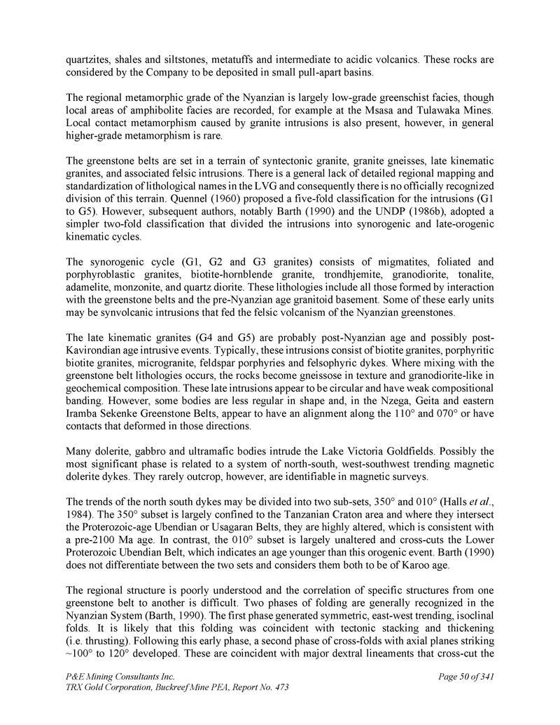 P & E Mining Consultants Inc. TRX Gold Corporation,Buckreef Mine PEA,第473号报告第50页,共341个石英岩、页岩和粉砂岩、元土层和中酸性火山岩。该公司认为这些岩石沉积在小的拉开盆地中。Nyanzian的区域变质品位主要是低品位绿片岩相,尽管记录了局部地区的角闪岩相,例如在Msasa和Tulawaka矿区。花岗岩侵入体引起的局部接触变质作用也存在,但一般较高等级的变质作用较少。绿岩带设置在同构造花岗岩、花岗片麻岩、晚期运动花岗岩、伴生长英质侵入体的地形中。LVG中普遍缺乏详细的区域测绘和岩性名称标准化,因此没有官方认可的这一地形划分。Quennel(1960)提出了入侵的五重分类(G1到G5)。然而,随后的作者,特别是Barth(1990)和UNDP(1986 b),采用了更简单的两重分类,将侵入体分为同生和晚期造山运动周期。同生循环(G1、G2和G3花岗岩)由混合岩、叶状和斑岩花岗岩、黑云母-角闪石花岗岩、长角闪岩、花岗闪长岩、花岗闪长岩、云长岩、硬质岩、二长岩、石英闪长岩组成。这些岩性包括所有与绿岩带和前Nyanzian时代花岗岩基底相互作用形成的岩性。其中一些早期单元可能是同火山侵入体,为Nyanzian绿岩的长英质火山作用提供了营养。晚期运动学花岗岩(G4和G5)可能是后Nyanzian时代,也可能是后Kavirondian时代侵入性事件。通常,这些侵入体由黑云母花岗岩、斑状黑云母花岗岩、微花岗岩、长石斑岩和长石岩脉组成。在与绿岩带岩性发生混合的地方,岩石在质地上变成了片麻岩,在地球化学成分上变成了花岗闪长岩。这些晚期侵入体看起来是圆形的,有弱的成分带状。然而,有些物体的形状不太规则,在Nzega、Geita和东部Iramba Sekenke绿岩带,似乎沿着110 ↓和070 ↓有一条对线,或者有在这些方向变形的触点。许多辉绿岩、辉长岩和超镁铁质体侵入维多利亚湖金田。可能最显著的阶段与一个南北走向、西南向西走向的磁性辉绿岩岩脉系统有关。然而,它们很少露头,但在磁力调查中是可以识别的。南北堤坝的走势可分为350 ↓和010 ↓两个子集(Halls et al.,1984)。350 ↓亚群主要局限于坦桑尼亚克拉通地区,在它们与元古生代Ubendian或Usagaran带相交的地方,它们发生了高度蚀变,这与2100 Ma前的年龄一致。相比之下,010 ↓亚群基本上没有改变,并横切下元古宙乌本第带,这表明比这次造山事件更年轻的年龄。Barth(1990)没有区分这两组,认为他们都是卡鲁时代。区域结构知之甚少,从一条绿岩带到另一条绿岩带的具体结构的相关性很难。在Nyanzian系统中,通常认识到两个阶段的折叠(Barth,1990)。第一阶段产生对称,东西走向,等斜褶皱。这种折叠很可能是与构造堆叠和增厚(即推力)同时发生的。在这一早期阶段之后,开发了第二阶段的交叉折叠,其轴向平面撞击~100 ↓至120 ↓。这些与交叉切割的主要右旋线条重合