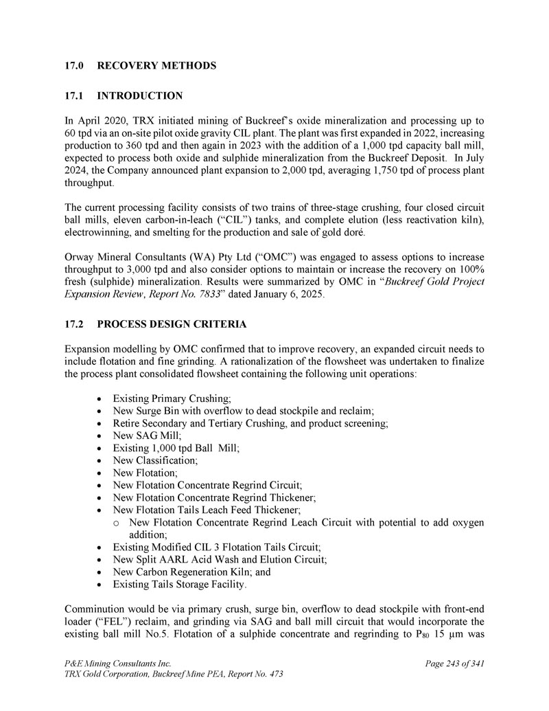 P & E Mining Consultants Inc. TRX Gold Corporation,Buckreef Mine PEA,第473号报告,共3411页第243页。恢复方法2。介绍于2020年4月,TRX通过现场中试氧化物重力CIL装置开始开采Buckreef的氧化物矿化并进行高达60tpd的加工。该工厂于2022年首次扩建,将产量提高到360吨/日,然后在2023年再次增加了1,000吨/日产能球磨机,预计将同时处理Buckreef矿床的氧化物和硫化物矿化。2024年7月,公司宣布工厂扩建至2000吨/日,平均1,750吨/日的加工厂吞吐量。目前的处理设施包括两列三级破碎、四台闭路球磨机、十一个碳入浸出(“CIL”)罐,以及用于生产和销售黄金dor é的完整洗脱(少再活化窑)、电积和冶炼。Orway Mineral Consultants(WA)Pty Ltd(“OMC”)受聘评估将吞吐量提高到3000吨/日的备选方案,并考虑维持或提高100%新鲜(硫化物)矿化的回收率的备选方案。结果由OMC在2025年1月6日的“Buckreef Gold Project Expansion Review,Report No. 7833”中总结。2.由OMC进行的工艺设计标准扩展建模证实,要提高回收率,扩展电路需要包括浮选和精磨。对流程表进行了合理化处理,以最终确定包含以下单元操作的工艺工厂合并流程表:现有的一次破碎;带有溢流的新浪涌箱到死库存和回收;退役二次和三次破碎,和产品筛选;新建SAG磨机;现有1000tpd球磨机;新分类;新建浮选;新建浮选精矿回磨回路;新建浮选精矿回磨增稠剂;新建浮选尾浸料增稠剂;o新建浮选精矿回磨浸出回路,具有添加氧气的潜力;现有改良型CIL 3浮选尾电路;新建分体式AARL酸洗洗洗出回路;新建碳再生窑;现有尾料贮存设施。粉碎将通过初级粉碎、调压箱、溢出到带有前端装载机(“FEL”)回收的死库存,以及通过SAG和球磨机电路进行研磨,这将包含现有的5号球磨机。A硫化物精矿浮选重磨成P8015 μ m为