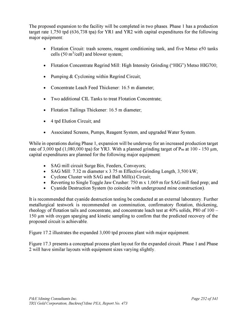 P & E Mining Consultants Inc. TRX Gold Corporation,Buckreef Mine PEA,第473号报告,第341页第252页该设施的拟议扩建将分两个阶段完成。Phase 1的生产目标率为1,YR1和YR2为750 tpd(636,738tpa),资本支出用于以下主要设备:浮选电路:垃圾筛、试剂调理池、和五个美卓e50罐式电芯(50m3/电芯)和鼓风机系统;浮选精矿再研磨机:高强度研磨(“HIG”)美卓HIG700;再研磨电路内的泵送和循环;精矿浸出进料增稠器:直径16.5 m;额外的两个CIL罐体处理浮选精矿;浮选尾矿增稠器:直径16.5 m;4tpd洗出电路;以及相关的筛网、泵、试剂系统、升级后的水系统。在第1阶段运营期间,将进行扩建,以提高YR 3的产量目标率,即3,000吨/日(1,080,000吨/年)。P规划粉磨目标为100-150 μ m,资本支出规划用于以下主要设备:SAG磨机电路浪涌仓、给料机、输送机;SAG磨机:直径7.32 m x有效粉磨长度3.75 m,3500 kW;带SAG和球磨机(s)电路的旋风簇;恢复为单拨动颚式破碎机:750 m x 1,069 m用于SAG磨机进料准备;以及氰化物破坏系统(以配合地下矿山建设)。建议在外部实验室进行氰化物破坏检测。建议对粉碎、确认浮选、增稠、浮选尾和精矿的流变学进行进一步的冶金测试,并在40%固体、P80为100 – 150 μ m的情况下进行精矿浸出测试,同时进行氧气喷射和动力学采样,以确认所提议电路的预测回收率是可以实现的。图17。2图示主设备扩建3000tpd工艺厂房。图17。3提出了扩展电路的概念性工艺工厂布局。第1阶段和第2阶段将有类似的布局,设备尺寸略有不同。