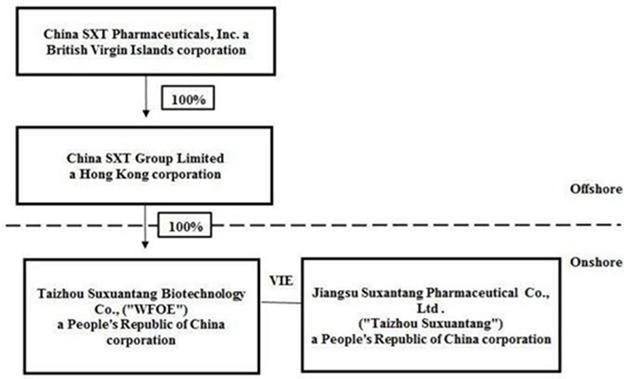 China SXT Pharmaceutical Inc.是一家英属维尔京群岛公司,持有其全资香港子公司中国SXT集团有限公司100%普通股。中国SXT集团有限公司持有泰州苏轩堂生物科技有限公司的全部股本,为外商独资企业。泰州苏轩堂生物科技有限公司通过一系列合同安排,控股我司经营主体江苏泰州苏轩堂药业有限公司。