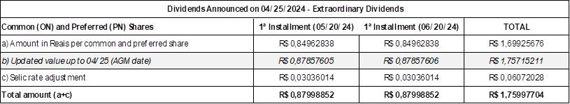 里约热内卢,2024年5月2日-Petr ó leo Brasileiro S.A-巴西国家石油公司跟进2024年4月25日发布的新闻稿,向股东通报与2023年12月31日余额相关的特别股息的薪酬价值,按Selic利率更新至2024年5月2日(记录日期)。