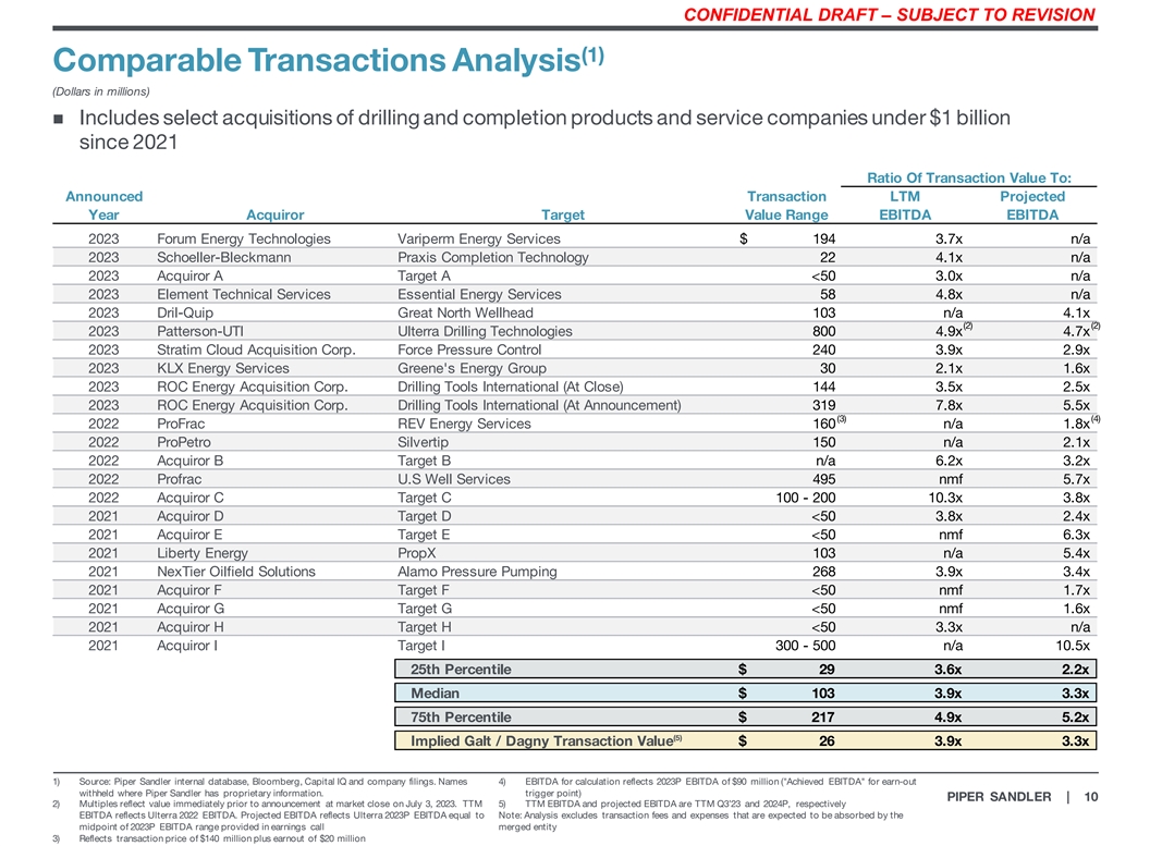 机密草案–以修订为准机密草案–以修订为准(1)可比交易分析(百万美元)n包括钻井和完井产品的选定收购和10亿美元以下的服务公司自2021年以来交易价值与:已公布交易LTM预计年份收购方目标价值范围EBITDA 2023丨Forum能源科技美国能源服务 $ 1943.7x n/a2023 Schoeller-Bleckmann Praxis完井技术224.1x n/a2023收购目标A < 503.0x n/a2023元素技术服务必要的美国能源服务 584.8x n/a2023丨dril-quip 丨Dril-Quip Great North井口103 n/a4.1x(2)(2)2023 Patterson-UTI Ulterra Drilling Technologies 8 004.9x 4.7x 2023丨Stratim Cloud Acquisition Corp. Stratim Cloud Acquisition Corp. force pressure control 2403.9x 2.9x 2023 KLX 美国能源服务1.6x 2023 ROC Energy Acquisition Corp. Drilling Tools International(at Close)144 3.5x 2.5x 2023 ROC Energy Acquisition Corp. Drilling Tools International(at Announcement)319 7.8x 5.5x(3)(4)2022 ProFrac REV 美国能源服务 160 n/a 1.8x 2022 ProPetro Silvertip 150 n/a 2.1x 2022 acquiror B target B n/a 6.2x 3.2x 2022 profrac U.S. Well Services 495 nmf 5.7x 2022 acquiror C target C 100-200 10.3x 3.8x 2021 acquiror D target D < 503.8x 2.4x 2021 acquiror E target E < 50nmf 6.3x 2021 TERM0Liberty Energy propX 1NexTier Oilfield Solutions Alamo压力泵2683.9x 3.4x 2021收购方F Target F < 50nmf 1.7x 2021收购方G Target G < 50nmf 1.6x 2021收购方H Target H < 503.3x n/a2021收购方I Target I 300-500 n/a 10.5x第25个百分位29 3.6x 2.2x中位数103 3.9x 3.3x第75个百分位217 4.9x 5.2x(5)隐含Galt/Dagny交易价值26 3.9x 3.3x 1)资料来源:Piper Sandler内部数据库、彭博、Capital IQ和公司文件。名称4)计算时的EBITDA反映2023P的EBITDA为9000万美元(在Piper Sandler拥有专有信息的情况下预扣盈利的已实现EBITDA。触发点)PIPER SANDLER | 102)倍数反映紧接在2023年7月3日收市时公布前的价值。TTM 5)TTM EBITDA和预计EBITDA分别为TTMQ3’23和2024年P,EBITDA分别反映Ulterra 2022年EBITDA。预计EBITDA反映Ulterra2023P EBITDA等于注:分析不包括预计将被财报电话会议合并实体3中提供的2023P EBITDA范围中点吸收的交易费用和支出)反映交易价格为1.4亿美元加上盈利2000万美元