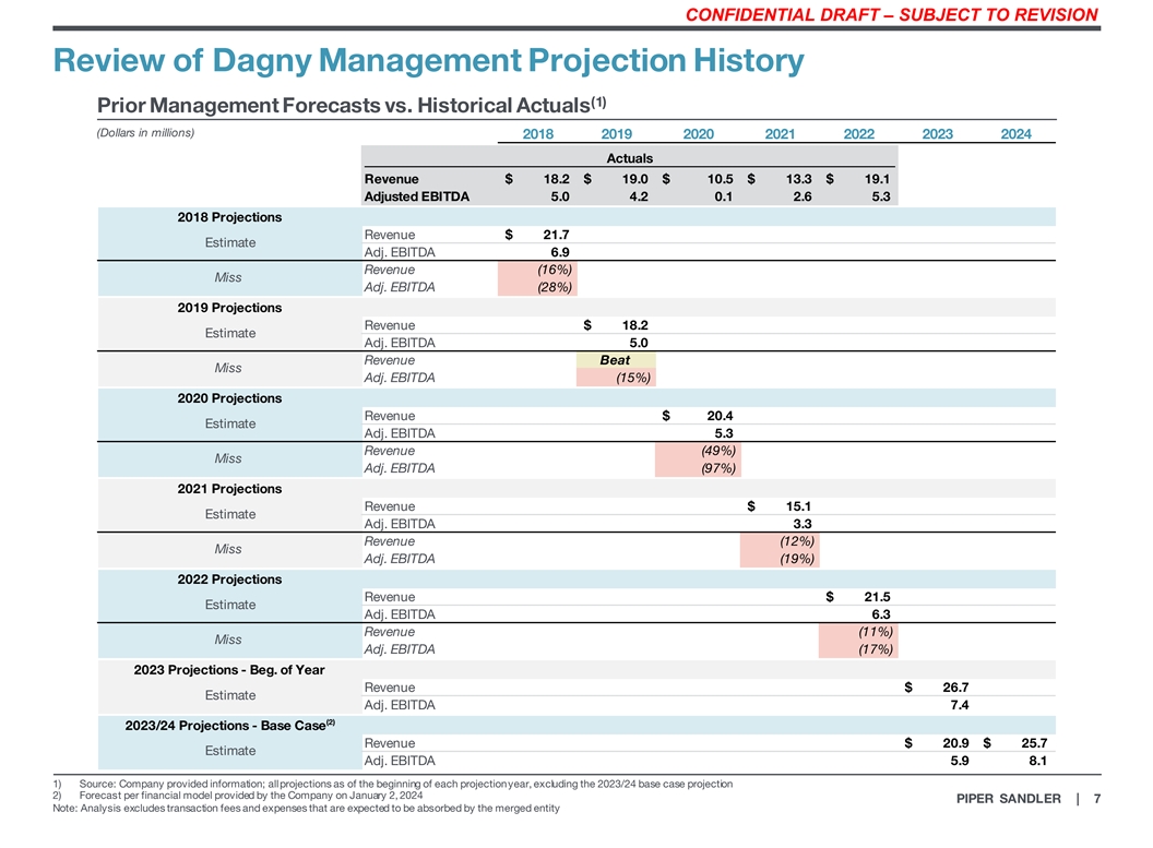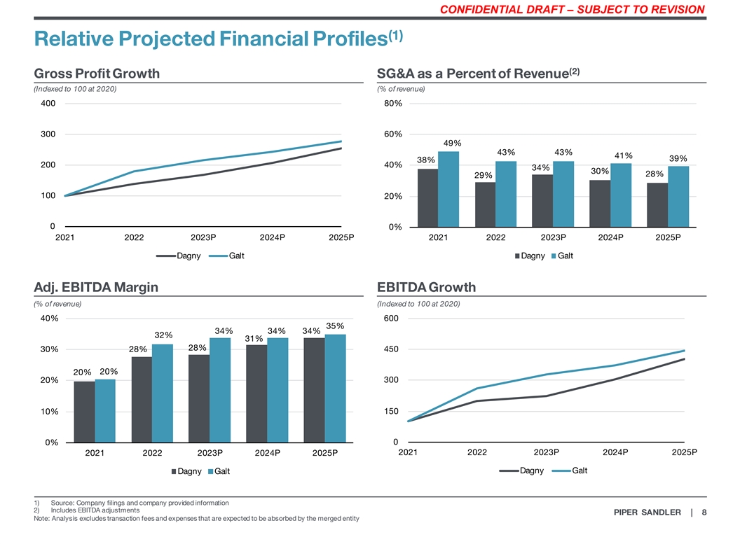 机密草案–须经修订机密草案–须经Dagny Management Projection History修订审查(1)先前管理层预测与历史实际数(百万美元)2018201920202021202220232024实际收入$ 18.2 $ 19.0 $ 10.5 $ 13.3 $ 19.1调整后EBITDA 5.0 4.2 0.1 2.65.3 2018 Projections revenue $ 21.7 Estimate Adj. EBITDA 6.9 revenue(16%)miss Adj. EBITDA(28%)2019 Projections revenue $ 18.2 Estimate Adj. EBITDA 5.0 revenue beat Miss Adj. EBITDA(15%)2020 Projections revenue $ 20.4 Estimate Adj. EBITDA 5.3 revenue(49%)miss调整后EBITDA(97%)2021年预测收入15.1美元估计调整后EBITDA 3.3收入(12%)未达到调整后EBITDA(19%)2022年预测收入21.5美元估计调整后EBITDA 6.3收入(11%)未达到调整后EBITDA(17%)2023年预测-年初收入26.7美元估计调整后EBITDA 7.4(2)2023/24预测-基本情况收入20.9美元25.7美元估计调整后EBITDA 5.9 8.11)资料来源:公司提供的信息;截至每个预测年度开始时的所有预测,不包括2023/24基本情况预测2)公司在1月2日提供的每个财务模型的预测,2024 PIPER SANDLER | 7注:分析不包括预计将由合并实体吸收的交易费用和开支