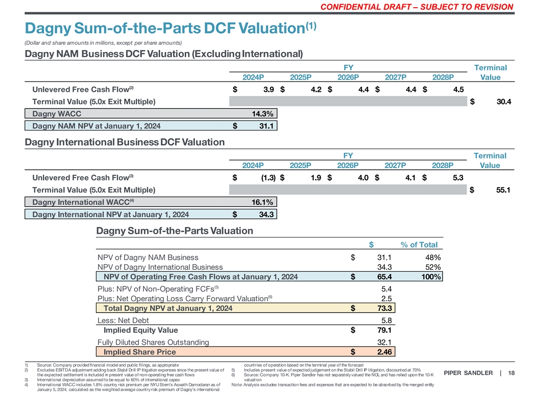 机密草案–以修订为准机密草案–以修订为准(1)Dagny部分总和DCF估值(美元和股份金额以百万计,每股金额除外)Dagny NAM业务DCF估值(不包括国际)FY终端2024p 2025p 2026p 2027p 2028p值(2)无杠杆自由现金流3美元。9 $ 4.2 $ 4.4 $ 4.4 $ 4.5终值(5.0x退出倍数)30美元。4 Dagny WACC 14.3% Dagny NAM NPV at January 1,2024 $ 31。1 Dagny International Business DCF Valuation FY Terminal 2024P 2025P 2026P 2027P 2028P Value(3)Unlevered Free Cash Flow $(1.3)$ 1。9 $ 4.0 $ 4.1 $ 5.3终值(5.0x退出倍数)55美元。1(4)达格尼国际WACC 16.1%达格尼国际2024年1月1日NPV 34美元。3 Dagny部分总和估值$% of Total NPV of Dagny NAM business $ 31。148% Dagny国际业务NPV 34。352% 2024年1月1日经营自由现金流净现值65美元。4100%(5)加:非经营性FCFs的NPV 5。4(6)加:净经营亏损结转估值2。5截至2024年1月1日的总Dagny NPV为73美元。3减:净负债5。8隐含股权价值79美元。1股全面摊薄流通股32。1隐含股价$ 2。461)资料来源:公司提供财务模型和公开备案,根据预测的终端年份酌情运营国家2)不包括EBITDA调整加回Stabil Drill知识产权诉讼费用自现值5)包括对Stabil Drill知识产权诉讼的预期判决现值,按70%折现PIPER Sandler | 18预计结算计入非经营性自由现金流现值6)资料来源:公司10-K。Piper Sandler没有对NOL进行单独估值,而是依赖于10-K 3)假设国际折旧等于国际资本支出估值的60% 4)国际WACC包括1.8%的国家风险溢价每NYU Stern的Aswath Damodaran截至附注:分析不包括预计将于2024年1月5日由合并实体吸收的交易费用和开支;计算为Dagny的加权平均国家风险溢价国际