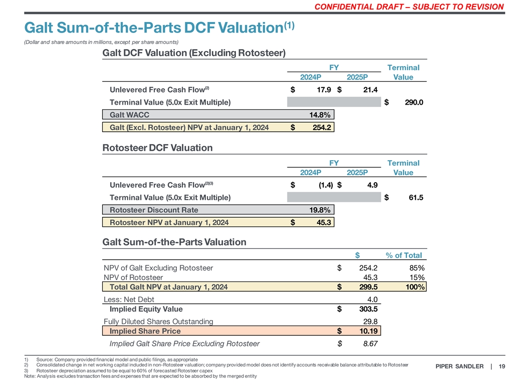 机密草案–以修订为准机密草案–以修订为准(1)Galt部分总和DCF估值(美元和股份金额以百万计,每股金额除外)Galt DCF估值(不包括Rotosteer)FY终端2024P 2025P值(2)无杠杆自由现金流17美元。9 $ 21.4终值(5.0x退出倍数)$ 290.0 Galt WACC 14.8% Galt(Excl。Rotosteer)2024年1月1日的净现值254美元。2 Rotosteer DCF估值FY终端2024P 2025P值(2)(3)无杠杆自由现金流$(1.4)$ 4。9终值(5.0x退出倍数)$ 61.5 Rotosteer贴现率19.8% Rotosteer NPV at January 1,2024 $ 45。3 Galt部分总和估值$%不包括Rotosteer的Galt总NPV 254美元。2 Rotosteer 45的85% NPV。32024年1月1日15% GLTNPV总额299美元。5100%减:净负债4。0隐含股权价值303美元。5股全面摊薄流通股29。8隐含股价10美元。19隐含Galt股价不包括Rotosteer 8.67美元1)资料来源:公司提供的财务模型和公开文件,视情况而定2)包含在非Rotosteer估值中的净营运资本的合并变化;公司提供的模型未识别归属于Rotosteer PIPER SANDLER的应收账款余额| 193)Rotosteer折旧假设等于预测Rotosteer资本支出的60%注:分析不包括预计将由合并实体吸收的交易费用和开支