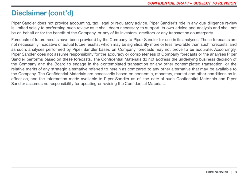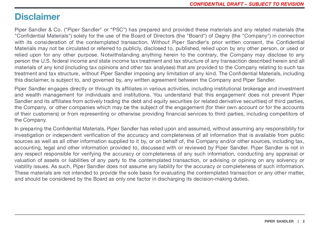 机密草案–受修订机密草案–受修订免责声明规限Piper Sandler & Co.(Piper Sandler或“PSC”)编制并提供该等材料及任何相关材料(机密材料),仅供达格尼(公司)董事会(董事会)审议拟进行的交易时使用。未经Piper Sandler事先书面同意,不得公开分发或提及机密材料、向任何其他人披露、发布、依赖这些材料,或为任何其他目的使用或依赖这些材料。尽管本文有任何相反的规定,公司仍可向任何人披露本文所述任何交易的美国联邦所得税和州所得税待遇和税收结构,以及向公司提供的与此类税收待遇和税收结构有关的所有类型的材料(包括税务意见和其他税收分析),而不受Piper Sandler施加任何类型的限制。包括本免责声明在内的机密材料受公司与Piper Sandler之间的任何书面协议的约束,并受其管辖。Piper Sandler直接或通过其关联公司从事各种活动,包括机构经纪以及为个人和机构提供的投资和财富管理。您的理解是,此项聘用并不妨碍Piper Sandler及其关联公司积极交易第三方、公司或可能作为聘用标的的其他公司的债务和股本证券(或相关衍生证券)或向第三方(包括公司的竞争对手)代理或以其他方式提供金融服务。在准备机密材料时,Piper Sandler一直依赖并承担,但不承担任何责任调查或独立核实从公开来源获得的所有信息以及由公司或代表公司和/或其他来源提供给它的所有其他信息的准确性和完整性,包括向Piper Sandler提供、与其讨论或审查的税务、会计、法律和其他信息。Piper Sandler在任何方面均不负责核实任何此类信息的准确性或完整性,不对拟进行的交易的任何一方的资产或负债进行任何评估或估值,也不就任何偿付能力或可行性问题提供建议或意见。因此,Piper Sandler对该等信息的准确性或完整性不承担任何责任。这些材料无意为评估拟进行的交易或任何其他事项提供唯一依据,董事会应将其视为履行决策职责的唯一因素。PIPER SANDLER | 2