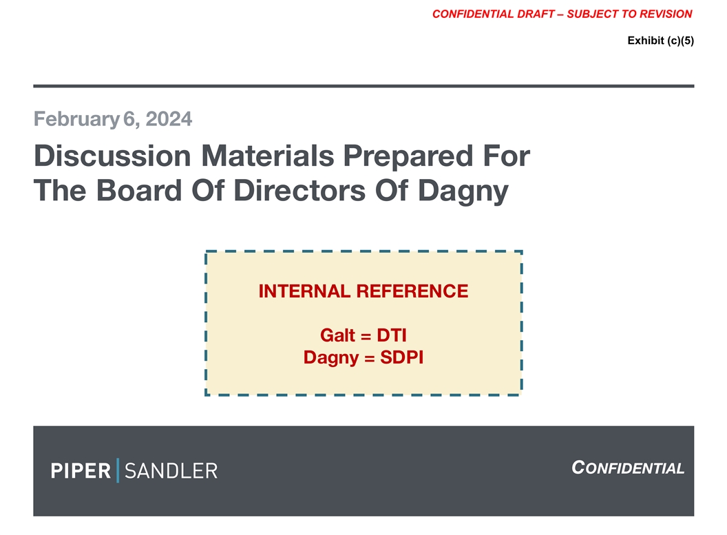 CO CONF NFi IDE DENT NTA AL L DR DRA AF FT T –– S SU UBJ BJE EC CT T T to O RE REV VIIS SIIO on N Confidential Draft – subject to revision exhibit 附件(c)(5)2024年2月6日为Dagny内部参考Galt = DTI Dagny = SDPI Confidential Piper Sandler董事会准备的讨论材料| 1