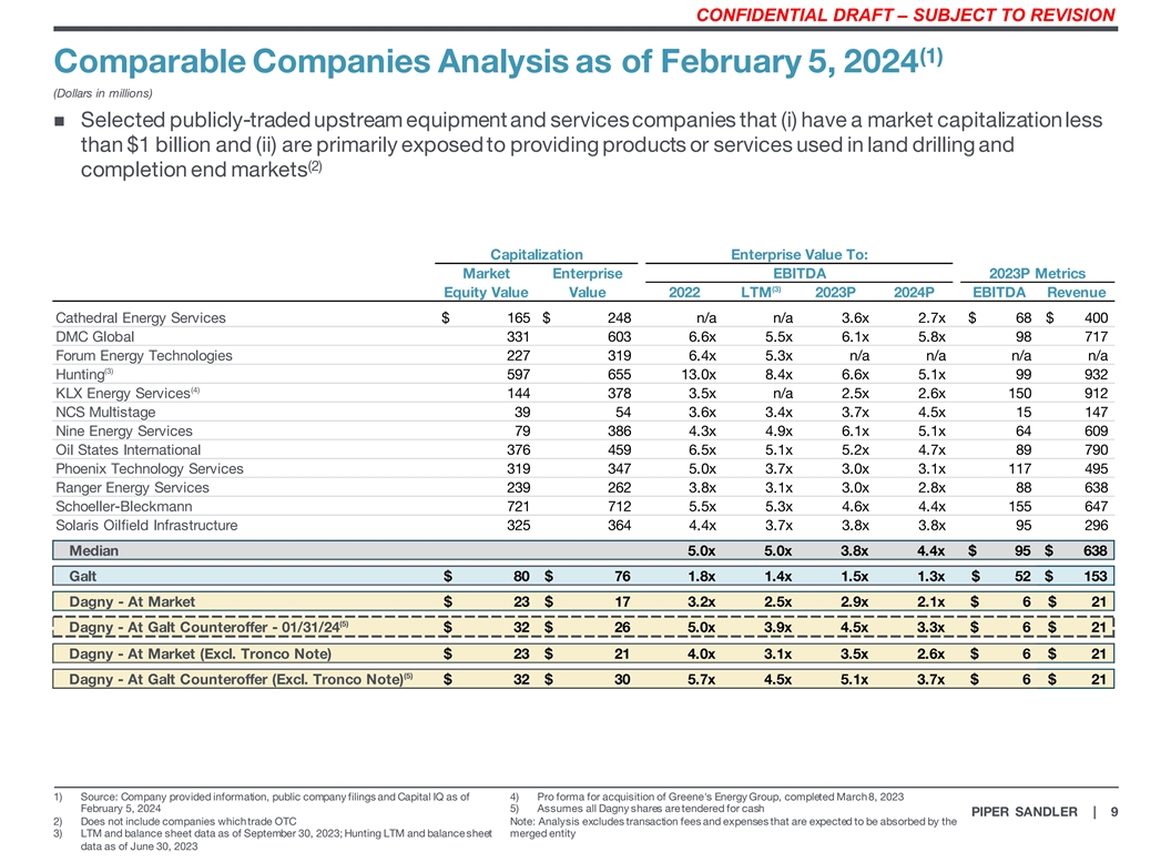 机密草案–以修订为准机密草案–以修订为准(1)截至2月5日的可比公司分析,2024(百万美元)n精选上市上游设备和服务公司(i)市值低于10亿美元和(ii)主要暴露于提供用于陆地钻探的产品或服务和(2)完成终端市场资本化企业价值到:市场企业EBITDA 2023P指标(3)股权价值2022LTM 2023P 2024P EBITDA收入大教堂美国能源服务 $ 165 $ 248 n/a n/a 3.6x 2.7x $ 68 $ 400丨DMC Global DMC Global 331603 6.6x 5.5x 6.1x 5.8x 98717丨Forum Energy Technologies Forum能源科技 2273 19 6.4x 5.3x n/a n/a n/a(3)Hunting 597655 13.0x 8.4x 6.6x 5.1x 99932(4)KLX 美国能源服务 144378 3.5x n/a 2.5x 2.6x 150912NCS Multistage 39543.6x 3.4x 3.7x 4.5x 15147美国能源服务 793864.3x 4.9x 6.1x 5.1x 64609 石油斯特国际 3764596.5x 5.1x 5.2x 4.7x 89790凤凰科技服务3193475.0x 3.7x 3.0x 3.1x 117495 Ranger能源 services 2392623.8x 3.1x 3.0x 2.8x 88638 Schoeller-Bleckmann 721712 5.5x 5.3x 4.6x 4.4x 155647 Solaris油田基础设施 3253644.4x 3.7x 3.8x 95296中值5.0x 5.0x 3.8x 4.4x $ 95 $ 638 Galt $ 80 $ 76 1.8x 1.4x 1.5x 1.3x $ 52 $ 153 Dagny-at market $ 23 $ 17 3.2x 2.5x 2.9x 2.1x $ 6 $ 21(5)Dagny-at Galt Counteroffer-0 1/31/24 $ 32 $ 26 5.0x 3.9x 4.5x 3.3x $ 6 $ 21 Dagny-at market(excl。Tronco Note)$ 23 $ 21 4.0x 3.1x 3.5x 2.6x $ 6 $ 21(5)Dagny-at Galt Counteroffer(Excl。Tronco Note)$ 32 $ 30 5.7x 4.5x 5.1x 3.7x $ 6 $ 211)资料来源:截至4日公司提供的信息、上市公司文件和Capital IQ)收购Greene's Energy Group的备考,已于2023年3月8日完成2024年2月5日5)假设所有Dagny股份均以现金PIPER SANDLER | 92)不包括进行场外交易的公司注:分析不包括预计将由3)LTM和截至9月30日的资产负债表数据吸收的交易费用和开支,2023;截至2023年6月30日的Hunting LTM和资产负债表合并实体数据