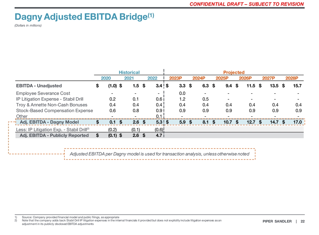 机密草案–以修订为准机密草案–以修订为准(1)Dagny调整后EBITDA桥(百万美元)历史预计2020202120222023P 2024P 2025P 2026P 2027P 2028P EBITDA-未调整$(1.0)$ 1。5 $ 3.4 $ 3.3 $ 6.3 $ 9.4 $ 11.5 $ 13.5 $ 15.7员工遣散费----0。0-----IP诉讼费用-稳定钻头0。2 0.1 0.6 1.2 0.5----Troy & Annette非现金奖金0。4 0.4 0.4 0.4 0.4 0.4 0.4 0.4 0.4以股票为基础的补偿费用0。6 0.8 0.9 0.9 0.9 0.9 0.9 0.9 0.9其他--0。1-------调整后EBITDA-达格尼模型0美元。1 $ 2.6 $ 5.3 $ 5.9 $ 8.1 $ 10.7 $ 12.7 $ 14.7 $ 17.0(2)减:IP Litigation Exp.-Stabil Drill(0.2)(0.1)(0.6)Adj. EBITDA-公开报告的$(0.1)$ 2。6 $ 4.7调整后EBITDA per Dagny模型用于交易分析,除非另有说明1)资料来源:公司提供的财务模型和公开文件,视情况而定2)请注意,公司在其提供的内部财务中加回了Stabil Drill IP诉讼费用,但没有明确将诉讼费用作为PIPER SANDLER | 22调整其公开披露的EBITDA调整