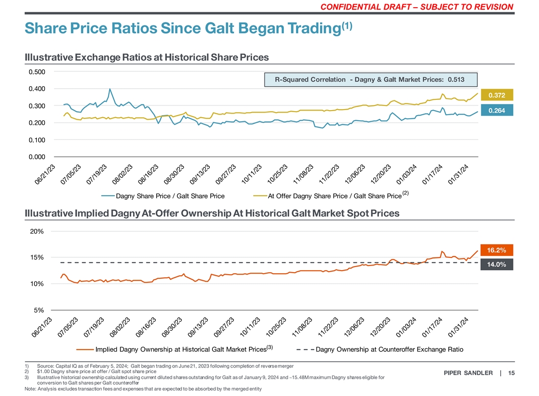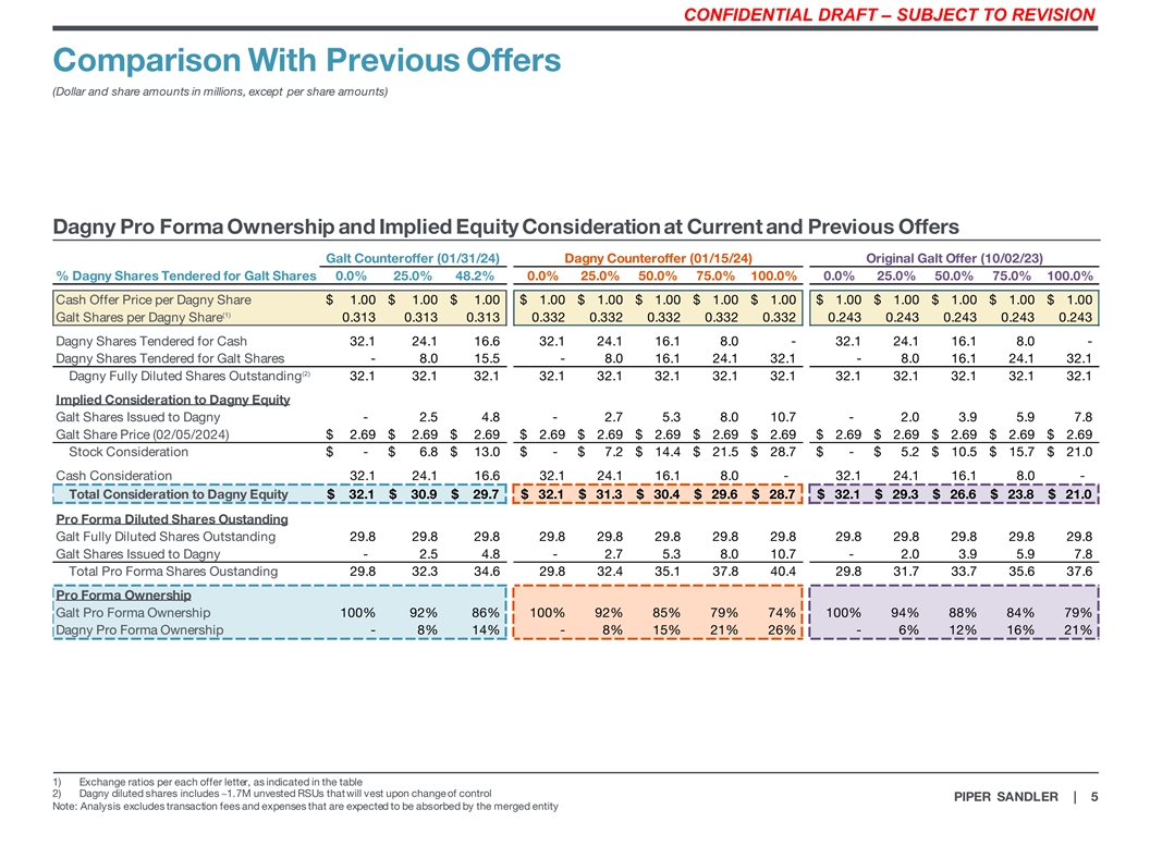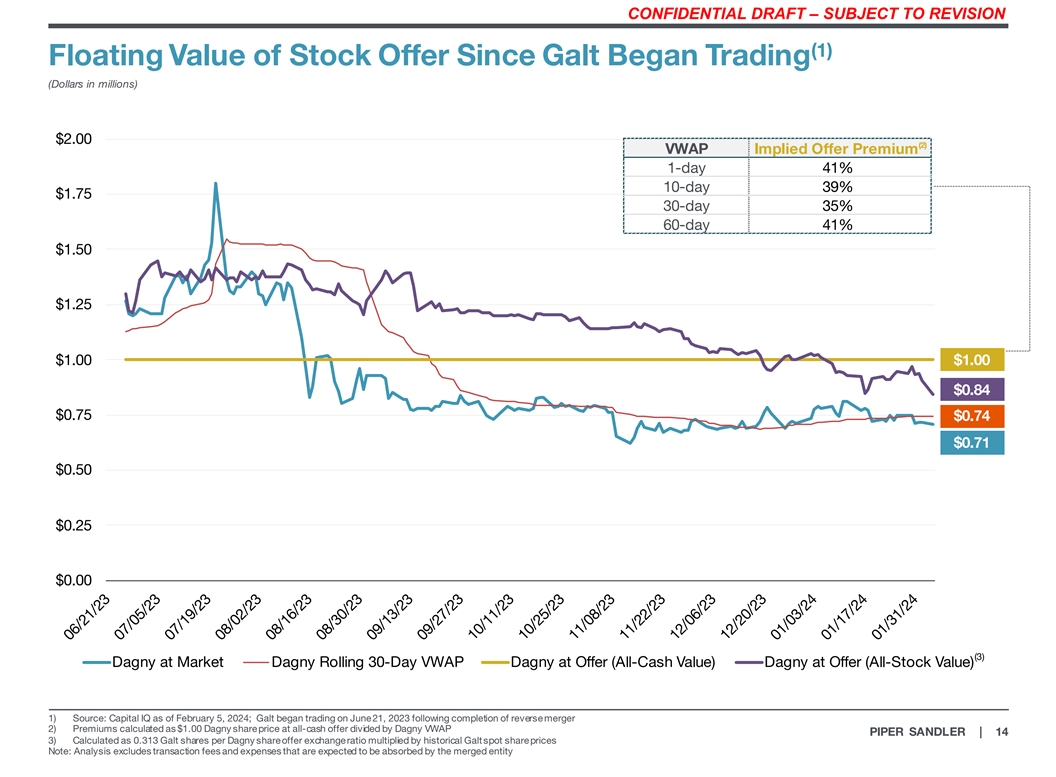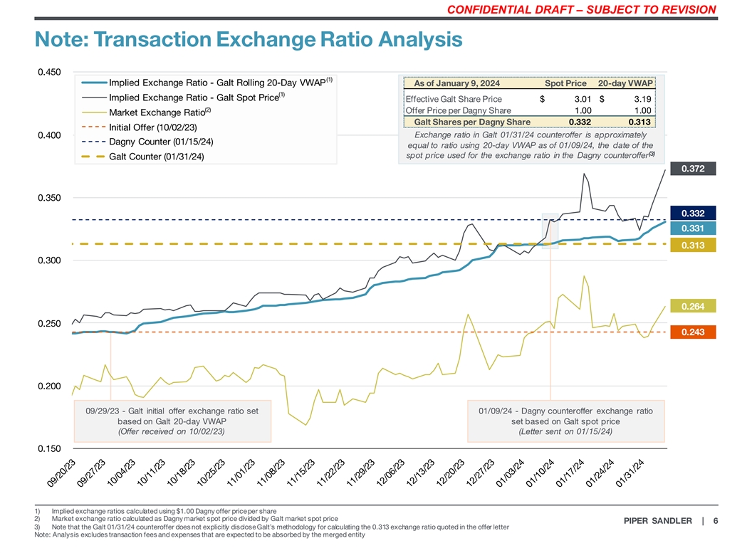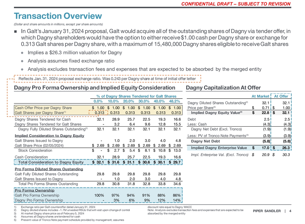 机密草案–须经修订机密草案–须经修订交易概览(美元和股份金额以百万计,每股金额除外)n在Galt于2024年1月31日的提议中,Galt将通过要约收购方式收购Dagny的所有已发行股份,其中Dagny股东可以选择以每股Dagny股份获得1.00美元现金或以每股Dagny股份换取0.313股Galt股份,最多15,480,000股Dagny股票有资格获得Galt股票l意味着Dagny的估值为2630万美元l分析假设固定交换比率l分析不包括预计将由合并后的实体吸收的交易费用和开支,反映了2024年1月31日的提议交换比率。在发出初步要约函时每股Dagny股份为0.243 Dagny Pro Forma Ownership及隐含股权对价Dagny Capital at Offer % of Dagny Shares Tendered for Galt Shares at Market at Offer 0.0% 10.0% 20.0% 30.0% 40.0% 48.2%(2)Dagny Diluted Shares Outstanding 32.13 2.1(3)Cash Offer Price per Dagny Shares $ 1.00 $ 1.00 $ 1.00 $ 1.00 $ 1.00 $ 1.00 Price per share $ 0.71 $ 1.00(1)(4)Galt Shares per Dagny Shares 0.31 30.31 30.31 30.313 Implied Dagny Equity Value $ 22.8 $ 32.1 Dagny Shares Tendered现金32.128.9 25.72 2.5 19.3 16.6债务2.5 2.5 Dagny Shares要约收购Galt Shares-3.26.49.61 2.81 5.5减:现金(4.3)(4.3)(2)Dagny完全稀释已发行股份32.13 2.13 2.13 2.13 2.13 2.13 2.1 Dagny净债务(不含Tronco)(1.9)(1.9)(5)对Dagny Equity的隐含对价减去:PV of Tronco Note Payments(3.9)(3.9)Galt Shares issued to Dagny-1.02 2.03 0.04 4.8 Dagny Net Debt(5.8)(5.8)Galt Share Price(02/05/2024)$ 2.69 $ 2.69 $ 2.69 $ 2.69 $ 2.69 $ 2.69 $ 2.69隐含Dagny Enterprise Value $ 17.0 $ 26.3股票对价$-$ 2.7 $ 5.4 $ 8.1 $ 10.8 $ 13.0 impl。企业Val。(不包括在内。Tronco)$ 20.9 $ 30.3现金代价32.128.9 25.72 2.5 19.3 16.6 Dagny Equity总代价$ 32.1 $ 31.6 $ 31.1 $ 30.6 $ 30.1 $ 29.7备考稀释股份未支配Galt完全稀释已发行股份29.82 9.82 9.82 9.82 9.8向Dagny发行的Galt股份-1.02 2.03 0.04 4.8备考股份总数29.83 0.83 1.83 3.83 4.6备考所有权Galt备考所有权100% 97% 94% 91% 88% 86% Dagny备考所有权-3% 6% 9% 12% 14% 1)交换比率日期为2024年1月31日的每Galt还价的贴现率等于Dagny WACC 2)Dagny稀释后的股份包括约170万股未归属的RSU,这些RSU将在控制权变更时归属注:分析不包括预计为PIPER SANDLER的交易费用和开支| 43)按合并实体吸收的截至2024年2月5日的市场Dagny股价4)假设所有Dagny股份均以现金投标5)管理层提供的Tronco票据付款时间表的现值;假设
