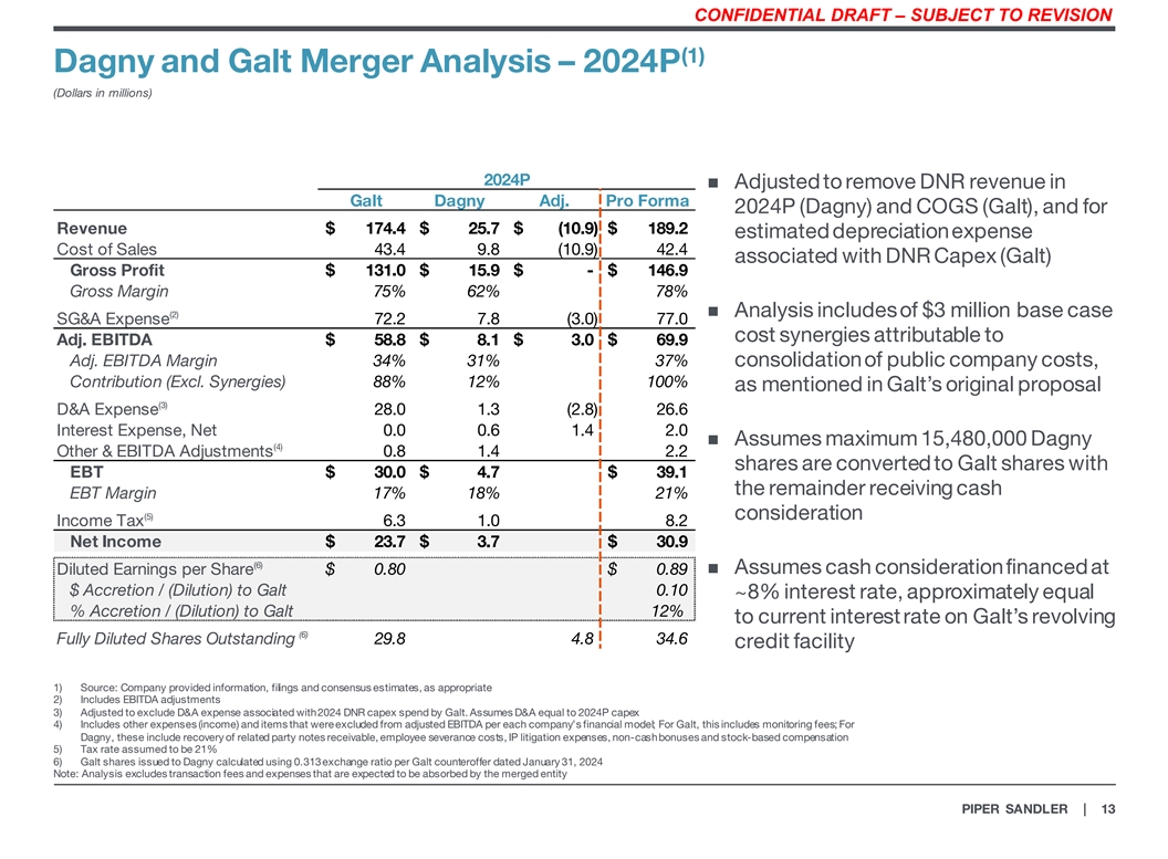 机密草案–以修订为准机密草案–以修订为准(1)Dagny和Galt合并分析– 2024p(百万美元)2024p n经调整以去除Galt Dagny Adj.中的DNRR收入。Pro Forma 2024p(Dagny)和COGS(Galt),收入为174美元。4 $ 25.7 $ ( 10.9) $ 189.2预计折旧费用销售成本43。4 9.8 ( 10.9) 42.4与DNR Capex(Galt)相关的毛利润131美元。0 $ 15.9 $ - $ 146.9毛利率75% 62% 78% n分析包括300万美元的基本情况(2)SG & A费用72。2 7.8 ( 3.0) 77.归属于Adj. EBITDA的成本协同增效为0美元。8 $ 8.1 $ 3.0 $ 69.9 Adj. EBITDA利润率34% 31% 37%合并上市公司成本、贡献(不含Synergies)88% 12% 100% as mentioned in Galt’s original proposal(3)D & A expense 28。0 1.3 ( 2.8) 26.6利息支出,净额0。0 0.6 1.4 2.0 n假设最多15,480,000 Dagny(4)其他& EBITDA调整0。8 1.4 2.2股转换为Galt股票,EBT为30美元。0 $ 4.7 $ 39.1剩余部分收到现金EBT保证金17% 18% 21%(5)对价所得税6。3 1.0 8.2净收入23美元。7 $ 3.7 $ 30.9(6)稀释后每股收益$ 0.80 $ 0.89n假设融资的现金对价为$ accretion/(dilution)至GLT0.10~8%的利率,大约等于% accretion/(dilution)至GLT12 %的当前利率对Galt的循环(6)完全稀释的已发行股份29.84.83 4.6信贷额度1)资料来源:公司提供的信息、备案文件和共识估计,视情况2)包括EBITDA调整3)经调整以排除与GLT2024年DNR资本支出相关的D & A费用。假设D & A等于2024年资本支出4)包括其他费用(收入)和根据每家公司的财务模型被排除在调整后EBITDA之外的项目;对于Galt,这包括监控费用;对于Dagny,这些费用包括关联方应收票据的回收、员工遣散费、知识产权诉讼费用、非现金奖金和基于股票的补偿5)假设税率为21% 6)向Dagny发行的Galt股份使用日期为2024年1月31日的每Galt还价0.31 3的交换比率计算注:分析不包括预计将由合并实体PIPER SANDLER | 13