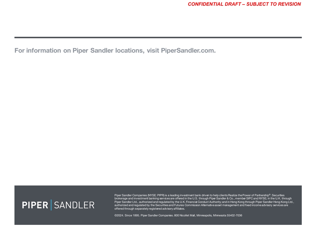 机密草案–须经修订的机密草案–须经修订的机密草案有关Piper Sandler地点的信息,请访问PiperSandler.com。® Piper Sandler Companies(NYSE:PIPR)是一家领先的投资银行,以帮助客户实现合伙的力量为驱动。在美国,通过成员SIPC和NYSE的Piper Sandler & Co.提供证券经纪和投资银行服务;在英国通过受英国金融行为监管局授权和监管的Piper Sandler Ltd.提供证券经纪和投资银行服务;在香港通过经证券及期货事务监察委员会授权和监管的Piper Sandler Hong Kong Ltd.通过单独注册的顾问关联公司提供另类资产管理和固定收益咨询服务。©2024.从1895年开始。Piper Sandler Companies。800 Nicollet Mall,Minneapolis,Minnesota 55402-7036 PIPER Sandler | 23