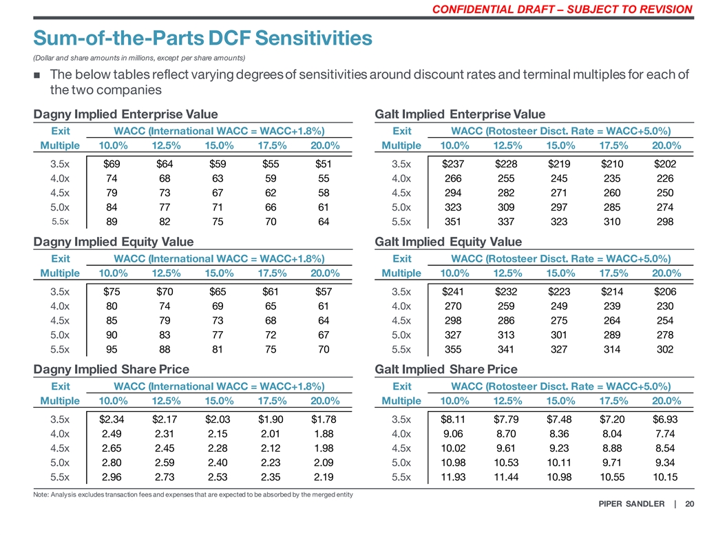 机密草案–受修订机密草案–受修订部分总和DCF敏感性(美元和股份金额以百万计,每股金额除外)n下表反映了两家公司各自围绕贴现率和终端倍数的不同程度的敏感性Dagny隐含企业价值Galt隐含企业价值退出WACC(国际WACC = WACC + 1.8%)退出WACC(Rotosteer Disct。Rate = WACC + 5.0%)Multiple 10.0% 12.5% 15.0% 17.5% 20.0% Multiple 10.0% 12.5% 15.0% 17.5% 20.0% 3.5x $ 69 $ 64 $ 59 $ 55 $ 51 3.5x $ 237 $ 228 $ 219 $ 210 $ 2024.0x 74686359554.0x 266255245235226 4.5x 79736762584.5x 2942822712602505.0x 8477716661 5.0x 323309297285274 5.5x 89827570645.5x 351337323310298 Dagny Implied Equity Value Galt Implied Equity Value Exit WACC(International WACC = WACC + 1.8%)Exit WACC(Rotosteer Disct。Rate = WACC + 5.0%)Multiple 10.0% 12.5% 15.0% 17.5% 20.0% Multiple 10.0% 12.5% 15.0% 17.5% 20.0% 3.5x $ 75 $ 70 $ 65 $ 61 $ 57 3.5x $ 241 $ 232 $ 223 $ 214 $ 2064.0x 80746965614.0x 2702592492392304.5x 8579736864 4.5x 2982862752642545.0x 90837772675.0x 3273133012892785.5x 9588817570 5.5x 355341327314302 Dagny Implied Share Price Galt Implied Share Price Exit WACC(International WACC = WACC + 1.8%)Exit WACC(Rotosteer Disct。Rate = WACC + 5.0%)倍数10.0% 12.5% 15.0% 17.5% 20.0%倍数10.0% 12.5% 15.0% 17.5% 20.0% 3.5x $ 2.34 $ 2.17 $ 2.03 $ 1.90 $ 1.78 3.5x $ 8.11 $ 7.79 $ 7.48 $ 7.20 $ 6.93 4.0x 2.49 2.31 2.15 2.01 1.88 4.0x 9.068.70 8.368.04 7.74 4.5x 2.65 2.45 2.28 2.12 1.98 4.5x 10.02 9.6 19.238.88 8.54 5.0x 2.80 2.59 2.40 2.23 2.09 5.0x 10.98 10.53 10.1 19.7 19.34 5.5x 2.96 2.73 2.53 2.35 2.19 5.5x 11.93 11.44 10.98 10.55 10.15注:分析不包括预计将由合并实体PIPER SANDLER吸收的交易费用和开支