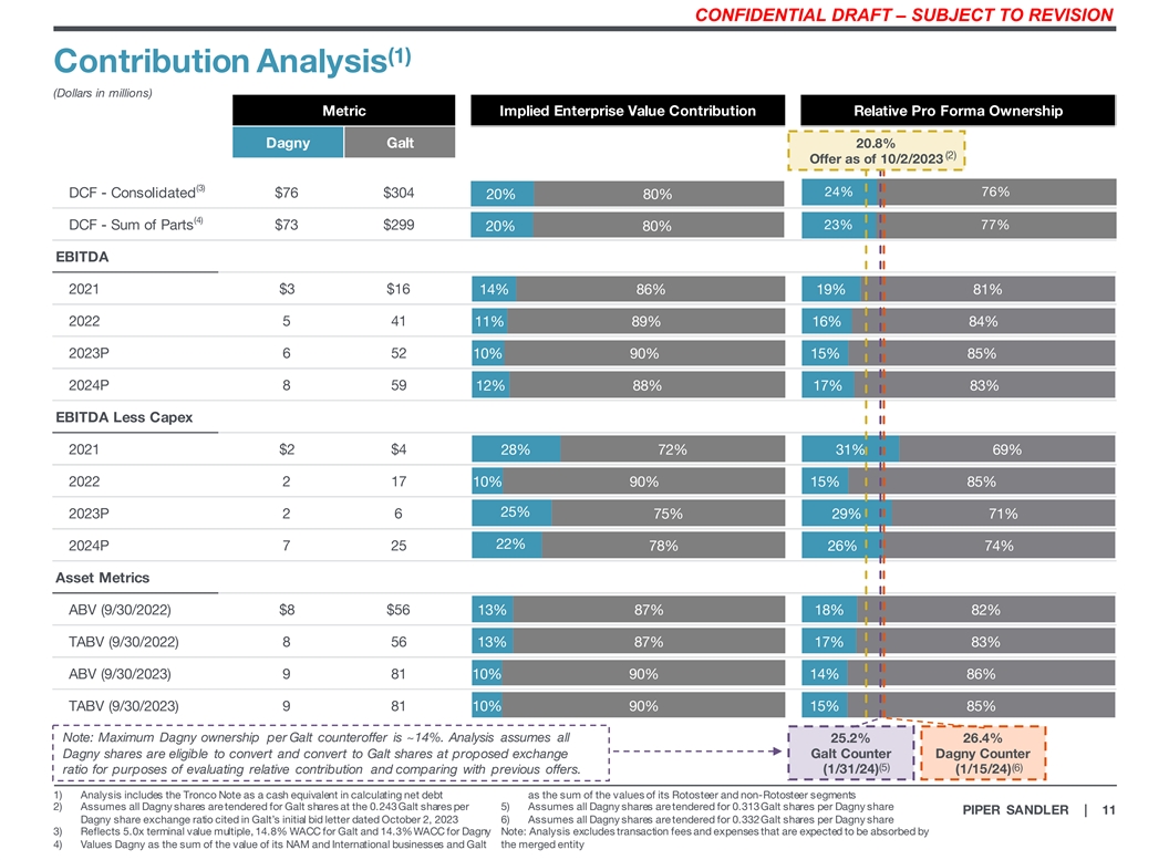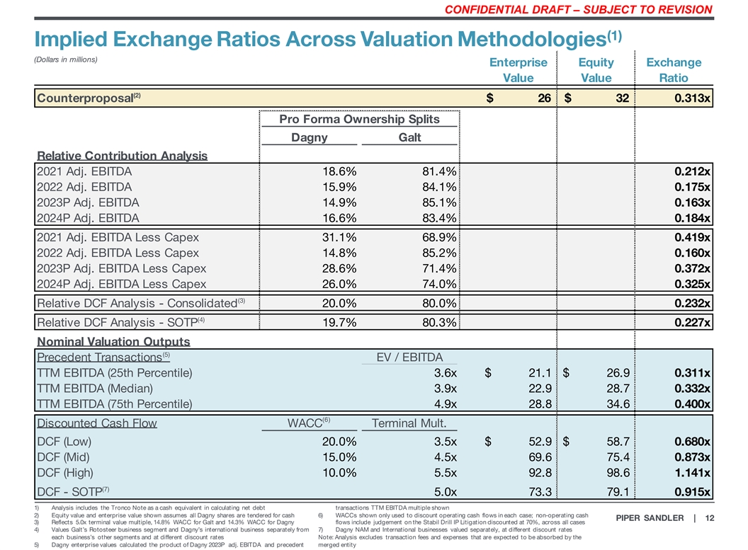 机密草案–受修订保密草案–受修订(1)贡献分析(百万美元)指标隐含企业价值贡献相对备考所有权Dagny Galt 20.8%(2)要约截至2023年10月2日(3)24% 76% DCF-合并$ 76 $ 30420% 80%(4)23% 77% DCF-部分总和$ 73 $ 29920% 80% EBITDA 2021 $ 3 $ 1614% 86% 19% 81% 202254111% 89% 16% 84% 2023P 652 10% 90% 15% 85% 2024P 85912% 88% 17% 83% EBITDA减去资本支出2021 $ 2 $ 428% 72% 31% 69% 202221710% 90% 90% 15% 85% 25% 2023P 2675% 29% 71% 22% 2024P 72578% 26% 74%资产指标ABV(9/30/2022)$ 8 $ 5613% 87% 18% 82% TABV(9/30/2022)85613%87% 17% 83% ABV(9/30/2023)98110% 90% 14% 86% TABV(9/30/2023)98110% 90% 15% 85%注:每个Galt还价的最大Dagny所有权为~14%。分析假设所有25.2% 26.4% Dagny股票都有资格按照提议的交换Galt Counter Dagny Counter(5)(6)比率转换和转换为Galt股票,以评估相对贡献并与之前的报价进行比较。(1/31/24)(1/15/24)1)分析将Tronco票据作为现金等价物计算净债务为其Rotosteer和非Rotosteer部分的价值之和2)假设所有Dagny股份以每5股0.243股Galt股份的价格被要约收购Galt股份)假设所有Dagny股份以每股Dagny股份0.313股Galt股份PIPER SANDLER | 11 Galt于2023年10月2日的初始投标函中引用的Dagny股份交换比率6)假设所有Dagny股份以每股Dagny股份0.332股Galt股份3)反映5.0倍终端价值倍数,Galt的WACC为14.8%,Dagny的WACC为14.3%注:分析不包括预计将由4)将Dagny估值为其NAM和国际业务的价值之和,并将合并后的实体Galt