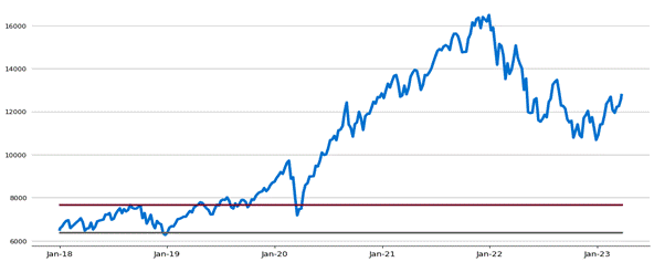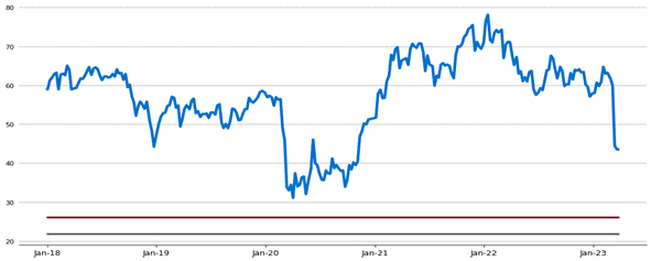 法律顾问。图中的水平深红线表示KRE的假设票息障碍为26.11美元(四舍五入到小数点后两位),这是KRE假设起始值43.52美元的60%,这是其2023年3月24日的收盘价。图中的水平灰线表示KRE的假设阈值为21.76美元,是KRE假设起始值的50%。实际起始值、票息障碍和阈值将在定价日确定。