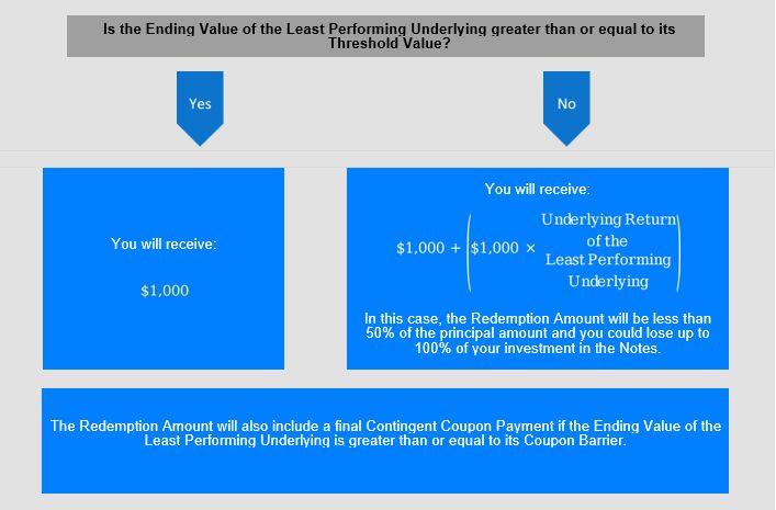 | ● | 假设债券未在到期前赎回,如果任何 基础资产下跌超过50从其起始价值的%,在到期时,您的投资将受到1:1的下行风险敞口,表现最差的标的价值下降,与高达100有风险的本金的百分比;否则,到期时你将收到本金。在到期时,您还将收到最后的特遣队如果观察值为每个 在最后观察日的基础资产大于或等于60起始值的%。 |