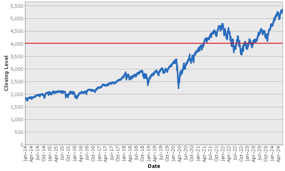 下图显示的是标普 500指数的收盘水平®2014年1月2日至2024年6月10日期间,可获得此类水平的每一天的指数。我们从Bloomberg L.P.获得了收盘水平,未经独立验证。你不应该把标普 500指数的历史水平®指数作为未来表现的指示。
