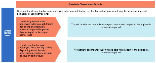 这些证券为投资者提供了一个赚取季度或有息票支付的机会,该金额相当于每份证券28.00美元(规定本金金额的2.80%),相对于不发生息票障碍事件的每个季度观察期而言。观察期内任何标的指数的收盘水平低于该标的指数在该观察期内任何交易日的票息障碍水平的,将在观察期内发生票息障碍事件。季度或有息票支付(如有)将于相关或有息票支付日按季度支付,该日为相关观察期结束日后的第三个营业日,或就季度或有息票支付(如有)而言,就最后观察期而言,为到期日。若观察期内发生票息障碍事件,投资者在相关的或有票息支付日将不会收到季度或有票息支付。有可能在证券期限内的部分或全部观察期发生票息障碍事件,因此您将收到很少或根本没有季度或有票息支付。我们将这些付款称为或有付款,因为无法保证您将在任何或有息票支付日收到付款。