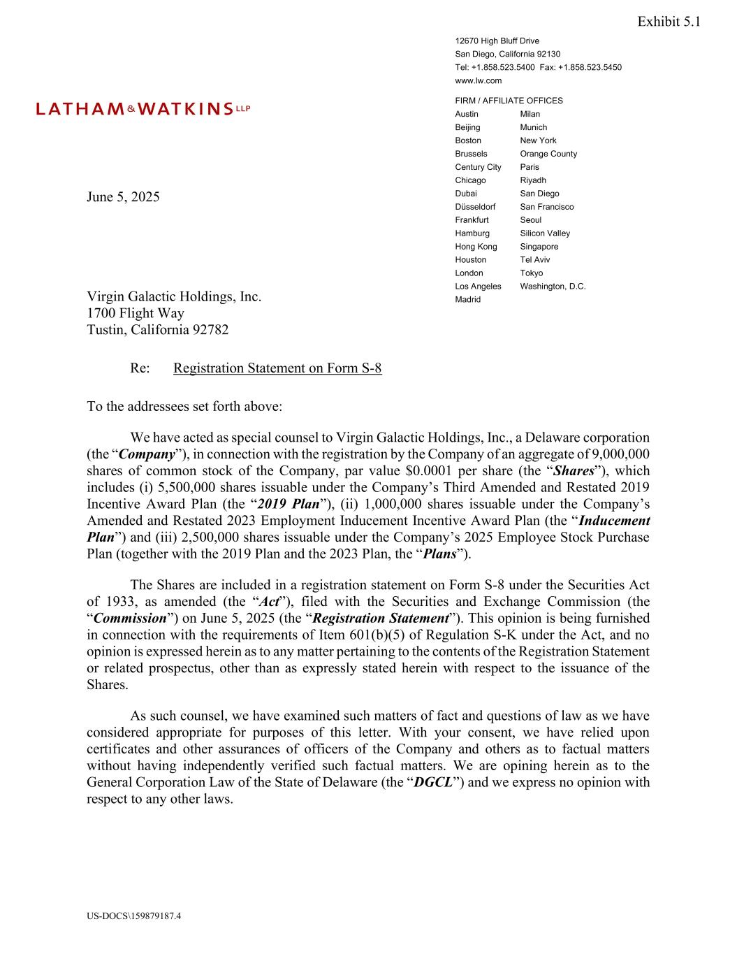 US-DOCS \ 159879187.412670 High Bluff Drive San Diego,California 92130电话:+ 1.85 8.52 3.5400传真:+ 1.85 8.52 3.5450 www.lw.com公司/附属办事处Austin Milan北京慕尼黑波士顿纽约布鲁塞尔Orange County世纪城巴黎芝加哥利雅得迪拜圣迭戈杜塞尔多夫旧金山法兰克福首尔汉堡硅谷香港新加坡休斯顿特拉维夫伦敦东京洛杉矶华盛顿特区马德里2025年6月5日丨维珍银河控股公司Virgin Galactic Holdings, Inc. 1700 Flight Way Tustin,California 92782 Re:Form S-8上的注册声明致上述收件人:我们已担任特拉华州公司Virgin Galactic Holdings, Inc.(“公司”)的特别顾问,与公司登记合共9,000,000股公司普通股,每股面值0.0001美元(“股份”)有关,其中包括(i)根据公司第三次经修订和重述的2019年激励奖励计划(“2019年计划”)可发行的5,500,000股,(ii)根据公司经修订和重述的2023年就业激励奖励计划(“激励计划”)可发行的1,000,000股,以及(iii)根据公司2025年员工股票购买计划(连同2019年计划和2023年计划,“计划”)可发行的2,500,000股。根据经修订的1933年《证券法》(“法案”)于2025年6月5日向美国证券交易委员会(“委员会”)提交的S-8表格登记声明(“登记声明”)中包含了这些股份。本意见是根据该法案规定的S-K条例第601(b)(5)项的要求提供的,除此处就发行股份明确说明的情况外,此处不对与注册声明或相关招股说明书内容有关的任何事项发表任何意见。作为这样的律师,我们审查了我们认为为本函目的适当的事实事项和法律问题。经贵方同意,我们在没有独立核实这些事实事项的情况下,就事实事项依赖公司高级人员和其他人的证明和其他保证。我们在此就特拉华州一般公司法(“DGCL”)发表意见,我们不对任何其他法律发表意见。