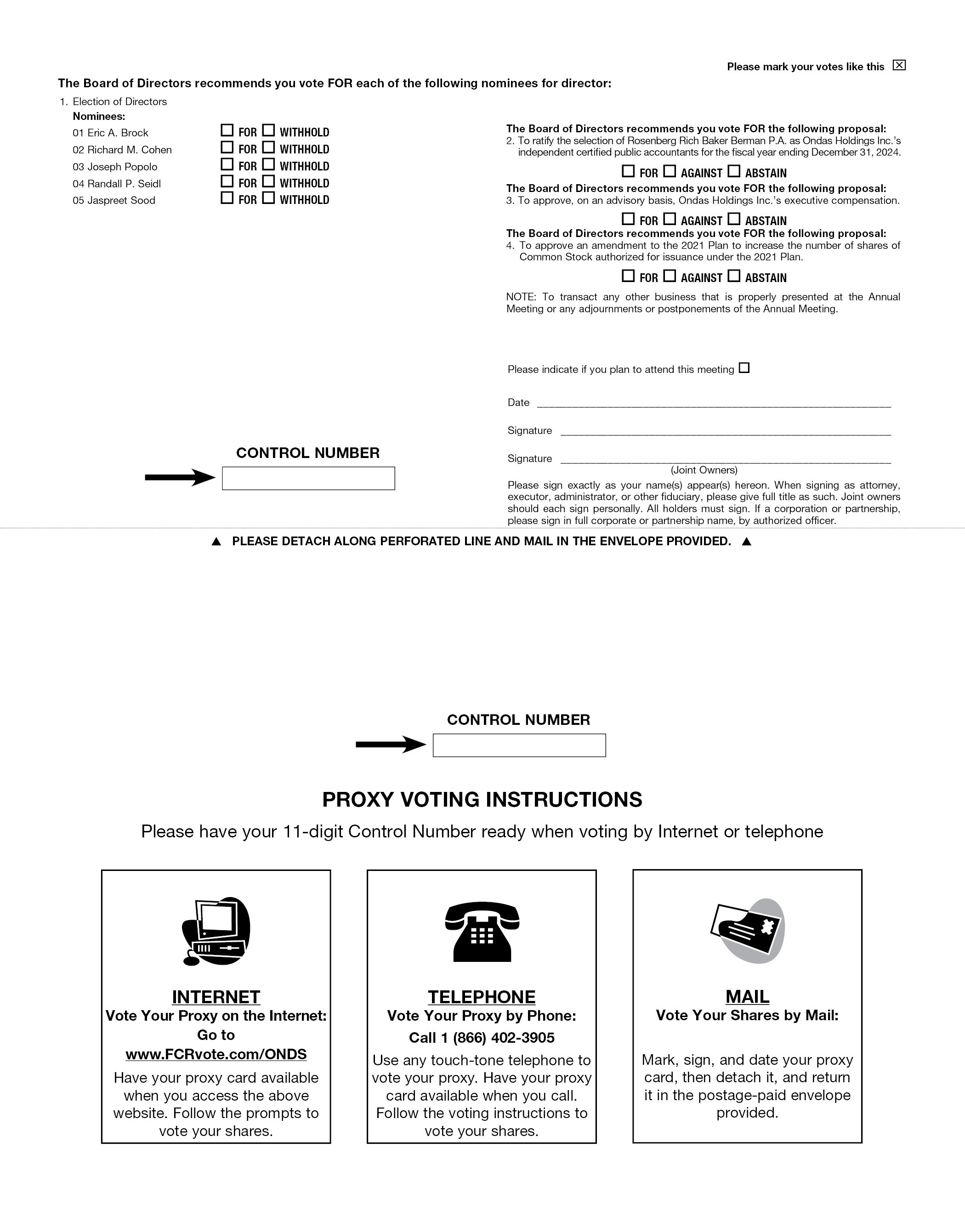 请这样标记您的投票x请沿着执行行分离,并在提供的信封中邮寄。请说明您是否计划出席本次会议o董事会建议您投票支持以下每一位董事提名人:1。选举董事提名人:01 Eric A. Brock支持退约02 Richard M. Cohen支持退约03 Joseph Popolo支持退约04 Randall P. Seidl支持退约05 Jaspreet Sood支持退约号日期签名(共同所有人)请完全按照您在此显示的姓名签名。以律师、被执行人、管理人、其他受托人身份签字时,请按此提供全称。共同所有人应各自亲自签字。所有持有人必须签字。如为法团或合伙企业,请签署完整的法团或合伙企业名称,由获授权人员签署。董事会建议您对以下提案投赞成票:2。批准选择Rosenberg Rich Baker Berman P.A.为Ondas Holdings Inc.截至2024年12月31日止财政年度的独立注册会计师。反对弃权董事会建议您对以下提案投赞成票:3。以谘询方式批准Ondas Holdings Inc.的高管薪酬。反对弃权董事会建议你对以下提案投赞成票:4。批准对2021年计划的修订,以增加根据2021年计划授权发行的普通股股份数量。反对弃权注:处理在年会上适当提出的任何其他事务或年会的任何休会或延期。控制号码代理投票须知互联网或电话互联网投票时请准备好您的11位控制号码在互联网上为您的代理人投票:请访问www.FCRVote.com/ONDS访问上述网站时请准备好您的代理卡。按照提示投票你的股份。电话为您的代理人投票:致电1(866)402-3905使用任何按键式电话为您的代理人投票。打电话时准备好代理卡。按照投票指示对您的股份进行投票。邮寄投票您的股份通过邮寄:标记,签名,日期您的代理卡,然后拆卸,并在提供的已付邮资信封中返回。
