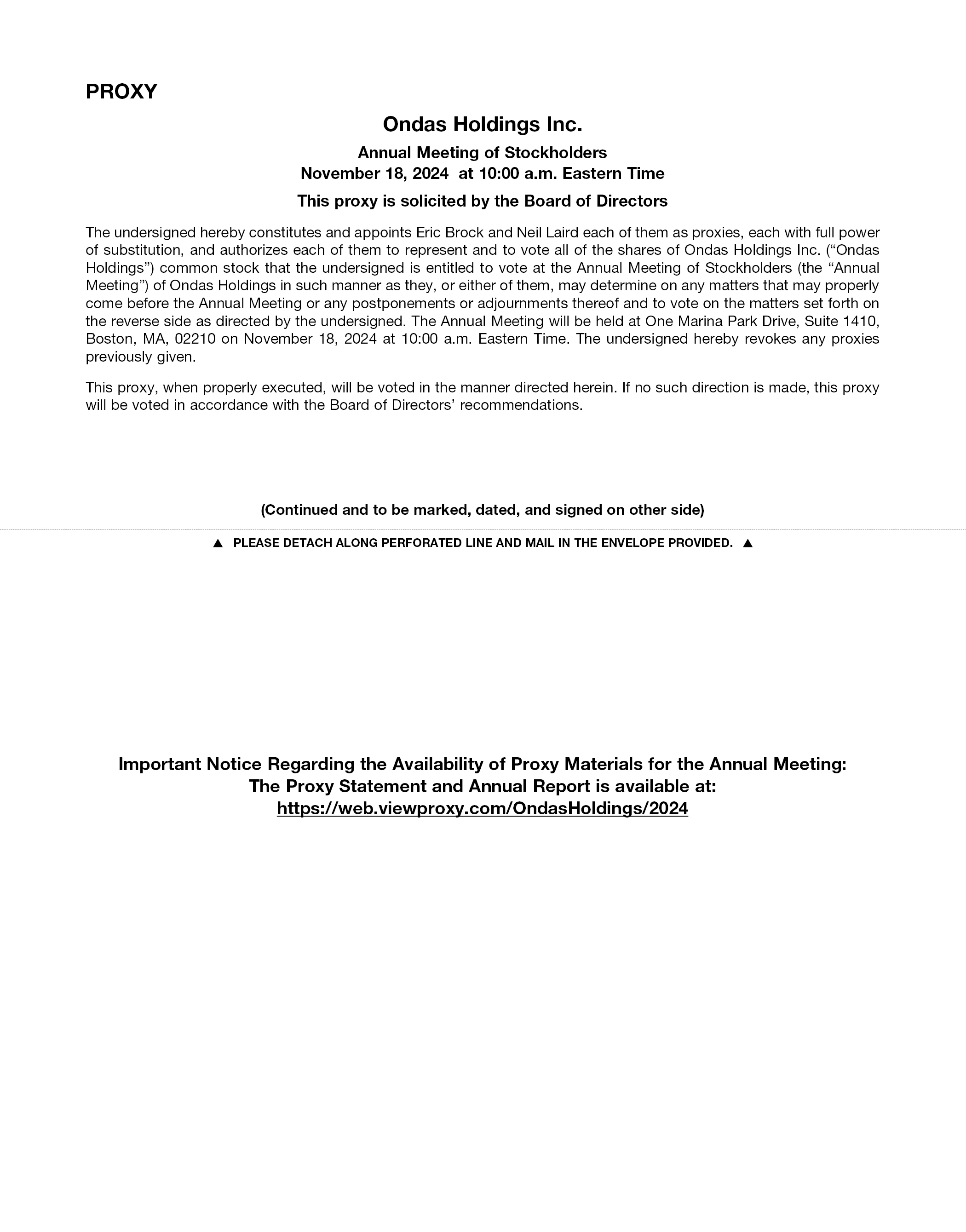 PROXY Ondas Holdings Inc.年度股东大会(“年度会议”)美国东部时间2024年11月18日上午10:00该委托书由董事会征集,以下签署人兹组成并任命Eric Brock和Neil Laird各自为代理人,各自具有完全替代权,并授权他们各自代表并投票于以下签署人有权在Ondas Holdings的年度股东大会(“年度会议”)上投票的全部股份(“年度会议”),其方式为TERM3或其中任何一方,可就年会或其任何延期或休会前可能适当提出的任何事项作出决定,并按以下签署人的指示就反面所列事项进行表决。年会将于美国东部时间2024年11月18日上午10:00在MA02466,Newton,Commonwealth Ave. 2345,MA02466,万豪酒店 Boston Newton酒店举行。下列签署人特此撤销先前给予的任何代理。此代理,当正确执行时,将按照此处指示的方式进行投票。如果没有做出这样的指示,这个代理将按照董事会的建议进行投票。(续并在另一侧注明、注明日期、落款)请在所提供的信封内沿已完结的行和邮件详细说明。关于提供年度会议代理材料的重要通知:代理声明和年度报告可在以下网址查阅:https://web.viewproxy.com/OndasHoldings/2024