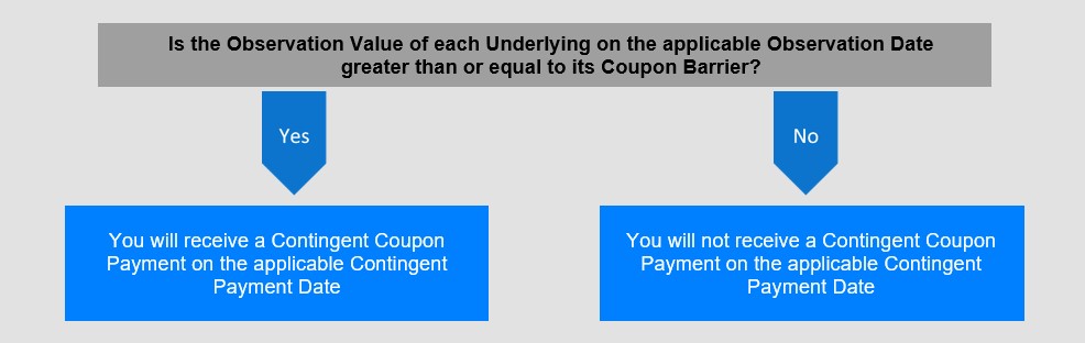 您可能不会收到任何或有息票付款。票据不提供任何定期固定息票支付。票据的投资者不一定会收到票据的任何或有息票付款。如果任何标的在某个观察日的观察值小于其票息障碍,您将不会收到适用于该观察日的或有票息支付。如果任何标的在票据期限内的所有观察日的观察值均低于其票息壁垒,则在票据期限内不会收到任何或有票息支付,也不会获得票据的正收益。