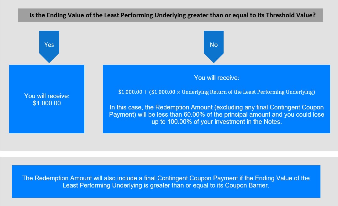 在这种情况下,赎回金额(不包括任何最终或有息票支付)将低于本金额的60.00%,您可能会损失高达100.00%的票据投资。