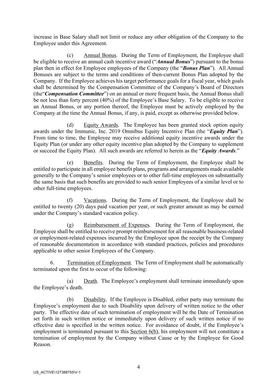 4 US _ ACTIVE \ 127388755 \ V-1增加基本工资不限制或减少公司在本协议项下对员工的任何其他义务。(c)年度奖金。在受雇期间,雇员有资格根据当时对公司雇员有效的奖金计划(“奖金计划”)获得年度现金奖励(“年度奖金”)。所有年度奖金均受公司采纳的当时现行奖金计划的条款及条件所规限。如果员工实现了一个会计年度的目标绩效目标,哪些目标应由公司董事会薪酬委员会(“薪酬委员会”)按年度或更频繁确定,年度奖金应不低于员工基本工资的百分之四十(40%)。要有资格获得年度奖金或其任何部分,雇员必须在支付年度奖金(如有)时积极受雇于公司,除非下文另有规定。(d)股权奖励。该员工已根据Immunic, Inc. 2019年综合股权激励计划(“股权计划”)获授股票期权股权奖励。雇员可不时根据股权计划(或根据公司为补充或接续股权计划而采纳的任何其他股权激励计划)获得额外股权激励奖励。所有这些奖项在此被称为“股权奖励”。(e)福利。在受雇期间,雇员有权参加向公司高级雇员或其他全职雇员普遍提供的所有雇员福利计划、计划和安排,其基础与向类似级别的高级雇员或其他全职雇员提供此类福利基本相同。(f)假期。在受雇期间,雇员有权享受每年二十(20)天的带薪休假,或根据公司标准休假政策可能获得的更多金额。(g)偿还费用。根据适用于公司其他高级员工的标准做法、政策和程序,在公司收到合理的文件后,员工在受雇期间有权获得员工所发生的所有合理的与业务相关或与雇佣相关的费用的及时补偿。6.终止雇用。第一次发生下列情形时,雇用期限自动终止:(a)死亡。雇员的雇用应在雇员死亡后立即终止。(b)残疾。如果雇员有残疾,任何一方可在向另一方送达书面通知后,因这种残疾而终止雇员的雇用。该等终止雇用的生效日期将为该书面通知所载的终止日期,如该书面通知未指明生效日期,则在该书面通知送达后立即生效。为免生疑问,如根据本条第6(b)款终止雇员的雇用,则该雇员的雇用将不构成公司无故或雇员有正当理由终止雇用。