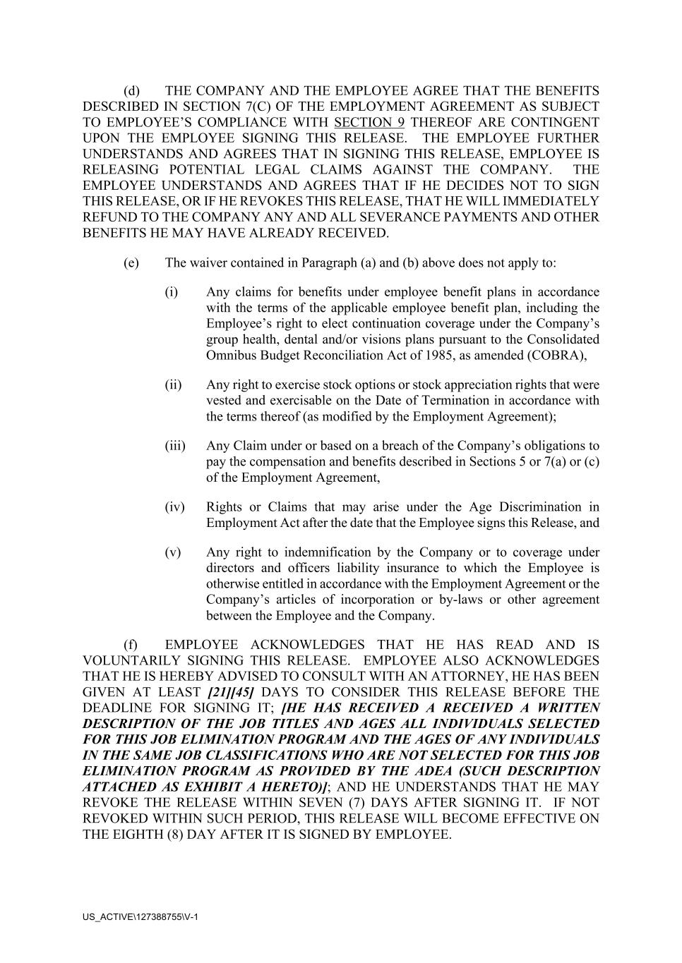 US _ active\ 127388755 \ v-1(d)公司和雇员同意,就业协议第7(c)节中描述的受雇员遵守第9条规定的利益是签署本新闻稿的雇员的或有利益。该员工进一步理解并同意,在签署本新闻稿时,该员工是在发布针对该公司的潜在法律索赔。该雇员理解并同意,如果他决定不签署这份新闻稿,或者如果他撤销这份新闻稿,他将立即向公司退还他可能已经收到的任何和所有遣散费和其他福利。(e)上述(a)和(b)段所载的豁免不适用于:(i)根据适用的雇员福利计划的条款对雇员福利计划下的福利提出的任何索赔,包括雇员根据经修订的《1985年综合预算调节法案》(COBRA)选择公司团体健康、牙科和/或视力计划下的延续保险的权利,(ii)在终止日期根据其条款(经《雇佣协议》修改)归属并可行使的任何行使股票期权或股票增值权的权利;(iii)根据或基于违反公司支付《雇佣协议》第5或7(a)或(c)节所述补偿和福利的义务而提出的任何索赔,(iv)在雇员签署本新闻稿之日后根据《就业年龄歧视法》可能产生的权利或索赔,及(v)雇员根据雇佣协议或公司的公司章程或附例或雇员与公司之间的其他协议而有权获得公司赔偿或董事及高级人员责任保险承保的任何权利。(f)员工承认他已阅读并自愿签署本新闻稿。员工还承认,特此建议他咨询律师,至少给了他[ 21 ] [ 45 ]天的时间在签署截止日期前考虑这一发布;[他收到了一份关于为这一消除工作方案选定的所有个人的工作头衔和年龄的书面说明,以及未按ADEA规定为这一消除工作方案选定的同一工作类别中的任何个人的年龄(此类说明ATT若在该期间内未撤销,本新闻稿将于雇员签署后的第八(8)天生效。