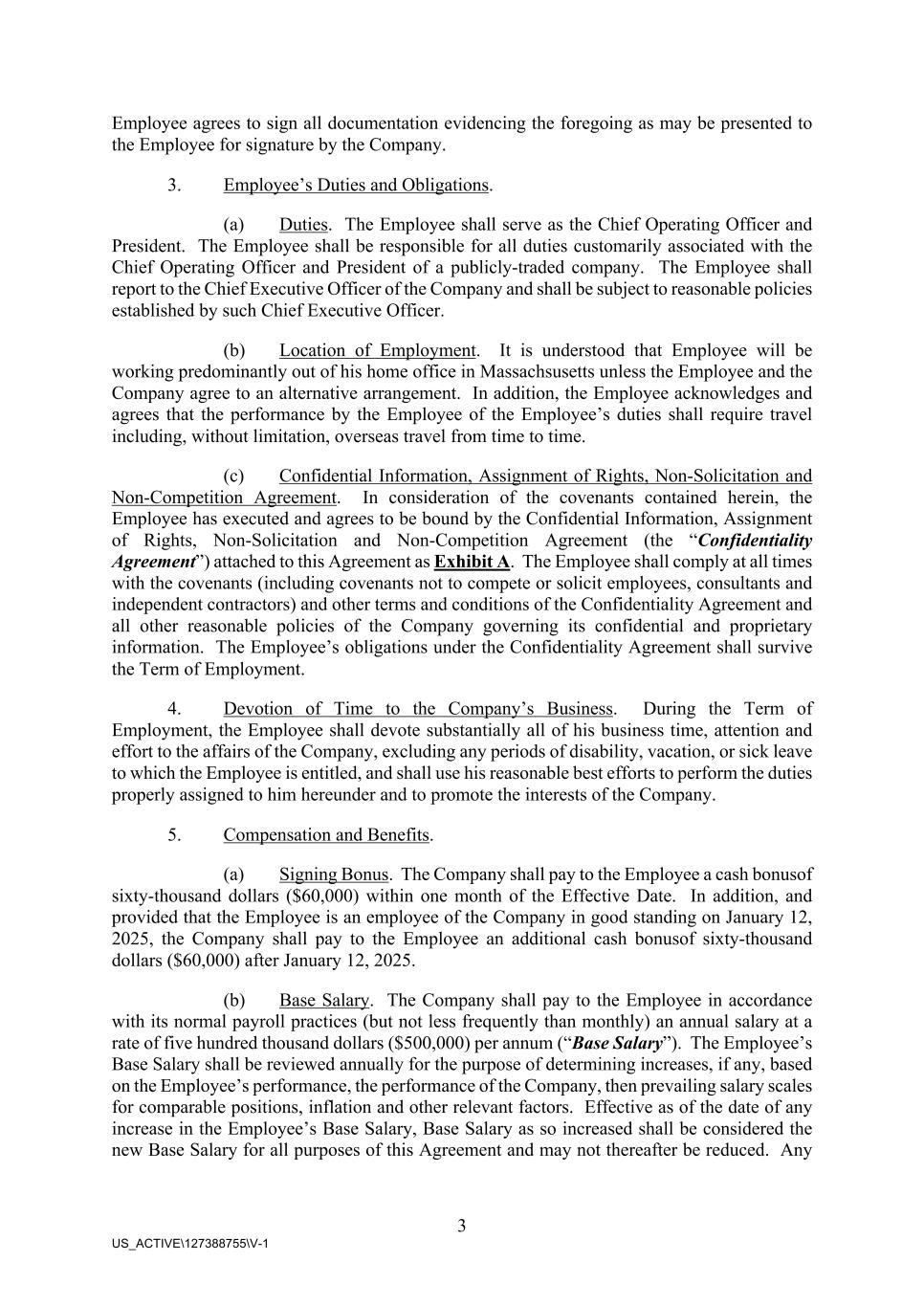 3 US _ ACTIVE \ 127388755 \ V-1 Employee同意签署公司可能提交给员工以供签署的所有证明前述内容的文件。3.员工的职责和义务。(a)职责。员工应担任首席运营官和总裁。员工应负责与上市公司的首席运营官和总裁通常相关的所有职责。雇员应向公司首席执行官报告,并应遵守该首席执行官制定的合理政策。(b)就业地点。据了解,除非员工和公司同意替代安排,否则员工将主要在其位于Massachsusetts的家庭办公室外工作。此外,雇员承认并同意,雇员履行雇员职责应要求旅行,包括但不限于不时出国旅行。(c)机密信息、权利转让、不招揽和不竞争协议。考虑到本协议所载的契诺,雇员已签署并同意受本协议所附的保密信息、权利转让、不招揽及不竞争协议(“保密协议”)的约束,作为附件 A。雇员应始终遵守保密协议的契诺(包括不竞争或不招揽雇员、顾问及独立承建商的契诺)及其他条款及条件,以及公司规管其保密及专有信息的所有其他合理政策。雇员在保密协议下的义务应在受雇期限内有效。4.对公司业务投入时间。在受雇期间,雇员应将其几乎所有的营业时间、注意力和精力投入到公司事务中,不包括雇员有权享有的任何残疾、休假或病假期间,并应尽其合理的最大努力履行根据本协议适当分配给他的职责,并促进公司的利益。5.补偿和福利。(a)签字奖金。公司应在生效日期的一个月内向员工支付六万美元(60,000美元)的现金奖金。此外,如果该雇员在2025年1月12日是公司信誉良好的雇员,公司应在2025年1月12日之后向该雇员支付额外的现金奖金6万美元(60,000美元)。(b)基薪。公司应按照其正常的发薪惯例(但不少于每月)向员工支付年薪,年薪为每年50万美元(500,000美元)(“基本工资”)。应每年审查雇员的基本工资,以便根据雇员的业绩、公司的业绩、然后是可比职位的现行薪金表、通货膨胀和其他相关因素,确定是否有任何增加。自雇员基薪增加之日起生效,就本协议的所有目的而言,如此增加的基薪应被视为新的基薪,此后不得减少。任何