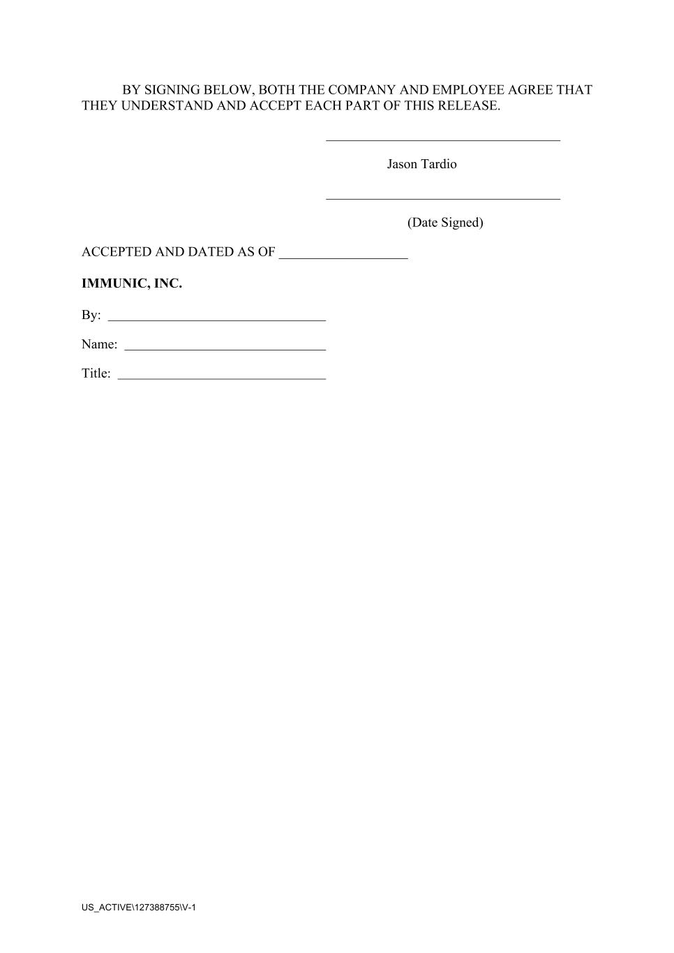US _ active \ 127388755 \ v-1通过在下面签署,公司和员工双方同意,他们理解并接受本新闻稿的每一部分。Jason Tardio(签名日期)被接受,日期截至______________________ IMMUNIC,INC。作者:姓名:标题: