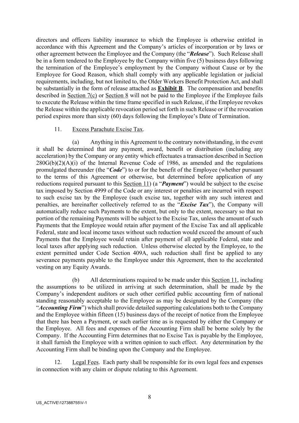 8 US _ ACTIVE \ 127388755 \ V-1董事和高级职员责任保险,雇员根据本协议和公司章程或根据法律或雇员与公司之间的其他协议有权获得(“解除”)。这种释放应采用公司在公司无故或雇员有正当理由终止雇员的雇用后五(5)个工作日内提交给雇员的形式,这应符合任何适用的立法或司法要求,包括但不限于《老年工人福利保护法》,并且应基本上采用作为附件 B所附的解除形式。如果雇员未能在该解除通知规定的时间范围内执行解除通知,如果雇员在该解除通知规定的适用撤销期内撤销该解除通知,或者如果撤销期在雇员终止日期后六十(60)天以上届满,则第7(c)节或第8节中所述的补偿和福利将不会支付给雇员。11.超额降落伞消费税。(a)尽管本协议中有任何相反的规定,但如果确定公司或任何实体为实现经修订的1986年《国内税收法典》第280g(b)(2)(a)(i)节所述交易而向雇员或为雇员的利益而颁布的条例(“守则”)(无论是否根据本协议的条款或其他方式,但在适用根据第11条要求的任何削减之前确定)(“付款”)将须缴纳《守则》第4999节规定的消费税或雇员就该等消费税产生的任何利息或罚款(该等消费税连同任何该等利息和罚款,以下统称为“消费税”),公司将自动减少该等付款,但仅限于必要的程度,以使剩余付款的任何部分均不需缴纳消费税,除非雇员在支付消费税和所有适用的联邦、州和地方所得税后在未进行此类削减的情况下将保留的此类付款的金额将超过雇员在应用此类削减后支付所有适用的联邦、州和地方税收后将保留的此类付款的金额。除非雇员另有选择,在《守则》第409A条允许的范围内,此类削减应首先适用于根据本协议应付给雇员的任何遣散费,然后适用于任何股权奖励的加速归属。(b)根据第11条规定须作出的所有决定,包括在作出该决定时所使用的假设,须由公司的独立核数师或公司可能指定的雇员合理可接受的其他具有国家地位的注册会计师事务所(“会计师事务所”)作出,该会计师事务所须在收到雇员关于已有付款的通知后十五(15)个工作日内向公司和雇员提供详细的支持性计算,或公司或雇员要求的更早时间。会计师事务所的一切费用和开支由公司单独承担。会计师事务所认定职工无需缴纳消费税的,应当向职工提供大意的书面意见。会计师事务所的任何认定对公司和员工均具有约束力。12.法律费用。与本协议有关的任何索赔或争议,每一方均应负责各自的法律费用和开支。