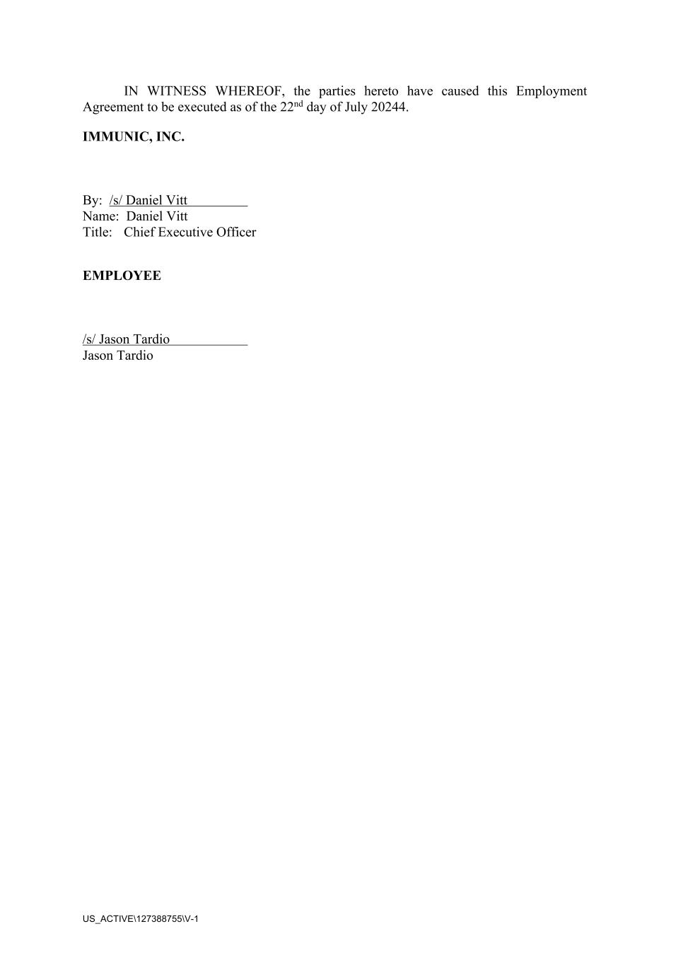 US _ active \ 127388755 \ v-1作为证人,本合同双方已促使本雇佣协议自2024年7月22日起执行。Immunic, Inc.作者:/s/Daniel Vitt姓名:Daniel Vitt职务:首席执行官Employee/s/Jason TardioJason Tardio