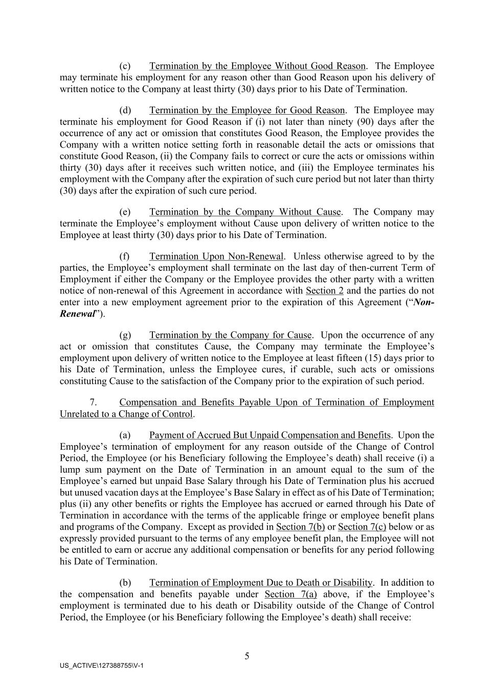 5 US _ active\ 127388755 \ v-1(c)员工无正当理由解雇。雇员可在其终止日期至少三十(30)天前向公司送达书面通知后,以良好理由以外的任何理由终止其雇用。(d)雇员因正当理由而解雇。如果(i)在构成正当理由的任何作为或不作为发生后不迟于九十(90)天内,雇员向公司提供一份书面通知,其中合理详细地载明构成正当理由的作为或不作为,(ii)公司未在收到该书面通知后三十(30)天内纠正或纠正该作为或不作为,雇员可出于正当理由终止其受雇,及(iii)雇员于该等补救期届满后但不迟于该等补救期届满后三十(30)天终止其在公司的雇用。(e)公司无故终止。公司可在雇员被解雇日期至少三十(30)天前向该雇员送达书面通知后,无故终止该雇员的雇用。(f)不续期即终止。除非双方另有约定,如果公司或员工根据第2节向另一方提供不续签本协议的书面通知,且双方未在本协议到期前订立新的雇佣协议(“不续签”),则员工的雇佣将在当时的雇佣期限的最后一天终止。(g)公司因故终止。一旦发生构成因由的任何作为或不作为,公司可在该雇员被解雇日期至少十五(15)天前向该雇员发出书面通知后终止该雇员的雇用,除非该雇员在该期间届满前已治愈(如可治愈)构成因由的该等作为或不作为,令公司信纳。7.与控制权变更无关的终止雇佣时应付的补偿和福利。(a)支付应计但未支付的补偿和福利。一旦员工因控制权变更期以外的任何原因终止雇佣,雇员(或其在雇员去世后的受益人)应在终止之日收到(i)一笔总付款项,金额等于雇员在终止之日已赚取但未支付的基本工资加上截至其终止之日有效的按雇员基本工资计算的应计但未使用的假期的总和;加上(ii)雇员根据公司适用的附加或雇员福利计划和计划的条款在其终止之日累积或赚取的任何其他福利或权利。除下文第7(b)条或第7(c)条规定或根据任何雇员福利计划的条款明确规定外,雇员将无权在其终止日期后的任何期间赚取或累积任何额外补偿或福利。(b)因死亡或残疾而终止雇用。除根据上述第7(a)节应支付的补偿和福利外,如果雇员在控制权变更期间之外因其死亡或残疾而终止雇用,雇员(或雇员死亡后的受益人)应获得: