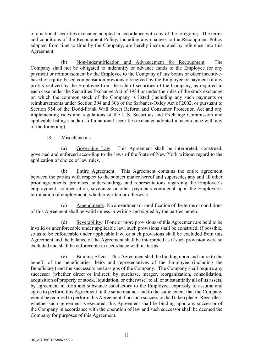 11 US _ ACTIVE \ 127388755 \ V-1根据前述任何一项通过的全国性证券交易所。补偿政策的条款和条件,包括公司不时采纳的补偿政策的任何变更,特此通过引用并入本协议。(b)不赔偿和垫付补偿。公司没有义务就雇员向公司支付或偿还雇员先前收到的任何奖金或其他基于激励或股权的补偿,或支付雇员从出售公司证券中实现的任何利润,向雇员进行赔偿或垫付资金,根据1934年《证券交易法》或公司普通股上市的证券交易所规则在每种情况下的要求(包括根据2002年《萨班斯-奥克斯利法案》第304和306条,或根据《多德-弗兰克华尔街改革和消费者保护法》第954条和美国证券交易委员会的任何实施规则和条例以及根据上述任何一项通过的全国性证券交易所的适用上市标准)。18.杂项(a)管辖法律。本协议应根据纽约州法律进行解释、解释、管辖和执行,而不考虑法律选择规则的适用。(b)全部协议。本协议包含双方就本协议标的事项达成的全部协议,并取代任何和所有其他先前关于雇员的雇佣、补偿、遣散费或其他视雇员终止雇佣而定的付款的协议、承诺、谅解和陈述,无论是书面的还是其他的。(c)修正。除非以书面形式并经双方签署,否则本协议的条款或条件的任何修改或修改均无效。(d)可分割性。如果本协议的一项或多项条款根据适用法律被认定为无效或不可执行,则应在可能的情况下将此类条款解释为根据适用法律可执行,或将此类条款排除在本协议之外,并将协议的余额解释为此类条款被如此排除,并应根据其条款可执行。(e)约束力。本协议对公司的受益人、继承人和雇员(包括受益人)的代表以及公司的继承人和受让人具有约束力,并符合其利益。公司应要求其全部或基本全部资产的任何继承人(无论是直接或间接的、通过购买、合并、重组、合并、收购财产或股票、清算或其他方式),通过员工满意的形式和实质协议,明确承担并同意以相同的方式和相同的程度履行本协议,如果没有发生此类继承,公司将被要求履行本协议。无论该协议是否执行,本协议均应根据法律的运作对公司的任何继承人具有约束力,就本协议而言,该继承人应被视为公司。