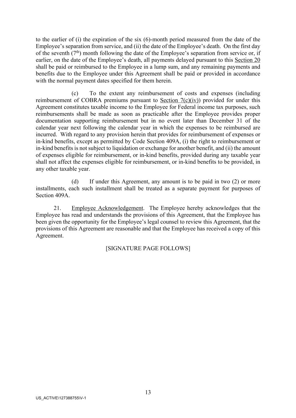 13 US _ active \ 127388755 \ v-1至(i)自雇员离职之日起计量的六(6)个月期间届满,及(ii)雇员死亡之日,两者中较早者。在雇员离职之日后的第七(7)个月的第一天,或如果更早,则在雇员死亡之日,根据本第20条延迟支付的所有款项应一次性支付或偿还给雇员,而根据本协议应支付给雇员的任何剩余款项和福利应按照本协议为其规定的正常支付日期支付或提供。(c)如果根据本协议规定的任何成本和费用报销(包括根据第7(c)(iv)节报销COBRA保费)构成雇员为联邦所得税目的的应税收入,则应在雇员提供适当的证明报销的文件后在切实可行范围内尽快进行此类报销,但在任何情况下不得迟于发生应报销费用的日历年的下一个日历年的12月31日。关于此处规定报销费用或实物福利的任何规定,除《守则》第409A条允许的情况外,(i)获得报销或实物福利的权利不受清算或交换另一种福利的限制,以及(ii)在任何纳税年度提供的有资格获得报销的费用或实物福利的金额不应影响在任何其他纳税年度有资格获得报销的费用或将提供的实物福利。(d)如果根据本协议,任何金额将分两(2)期或更多期支付,则为第409A条的目的,每一期此类分期付款应被视为单独的付款。21.员工致谢。雇员在此确认,雇员已阅读并理解本协议的规定,雇员已获得雇员法律顾问审查本协议的机会,本协议的规定是合理的,并且雇员已收到本协议的副本。[签名页如下]