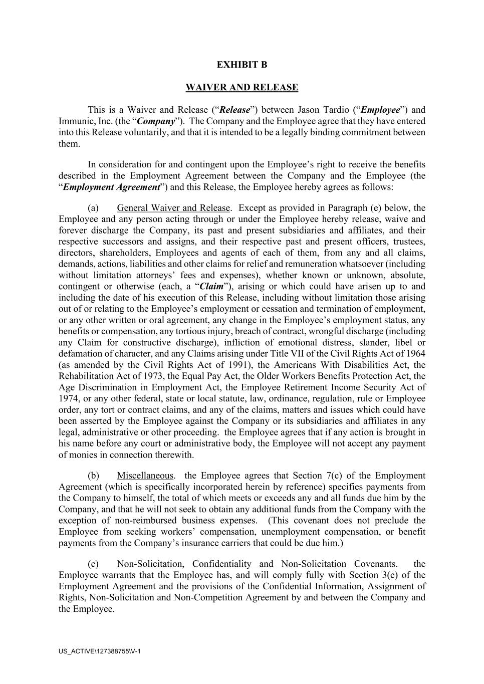 US _ ACTIVE \ 127388755 \ V-1附件B豁免和释放这是Jason Tardio(“员工”)与Immunic, Inc.(“公司”)之间的豁免和释放(“释放”)。公司与雇员同意,彼等自愿订立本解除协议,并有意作为彼等之间具有法律约束力的承诺。考虑到并视雇员有权获得公司与雇员之间的雇佣协议(“雇佣协议”)和本解除协议中所述的福利而定,雇员特此同意如下:(a)一般豁免和解除。除下文(e)段另有规定外,雇员及任何透过雇员行事或根据雇员行事的人,特此解除、放弃及永久解除公司、其过去及现在的附属公司及联属公司、其各自的继任人及受让人,及其各自过去及现在的高级人员、受托人、董事、股东、雇员及他们各自的代理人的任何及所有申索、要求、诉讼、责任及其他救济及薪酬申索(包括但不限于律师费及开支),不论已知或未知、绝对、或有的或其他(各自称为“申索”),产生或可能在其执行本解除令日期(包括该日期)之前产生,包括但不限于因雇员受雇或停止及终止雇用、或任何其他书面或口头协议、雇员受雇状况的任何改变、任何福利或补偿、任何侵权伤害、违约、不当解雇(包括任何推定解雇的要求)、造成情绪困扰、诽谤、诽谤或诽谤性格而产生或与之有关的情况,以及根据1964年《民权法案》(经1991年《民权法案》修订)、《美国残疾人法案》、1973年《康复法案》、《同工同酬法案》、《老年工人福利保护法》、《就业年龄歧视法案》、《1974年《雇员退休收入保障法》或任何其他联邦、州或地方法规、法律、法令、条例、规则或雇员令、任何侵权或合同索赔以及任何索赔,本可由雇员在任何法律、行政或其他程序中针对公司或其附属公司及联属公司主张的事项及问题。雇员同意,如以其名义向任何法院或行政机构提起任何诉讼,雇员将不接受任何与此有关的款项支付。(b)杂项。雇员同意《雇佣协议》第7(c)节(具体以引用方式并入本文)具体规定了公司向其本人支付的款项,其总额达到或超过公司应付给他的任何和所有资金,并且除未报销的业务费用外,他将不寻求从公司获得任何额外资金。(本契诺并不排除雇员向公司的保险承保人寻求可能应付给他的工人赔偿、失业补偿或福利付款。)(c)不招揽、保密和不招揽契诺。雇员保证雇员已经并将完全遵守雇佣协议第3(c)节以及公司与雇员之间的保密信息、权利转让、不招揽和不竞争协议的规定。