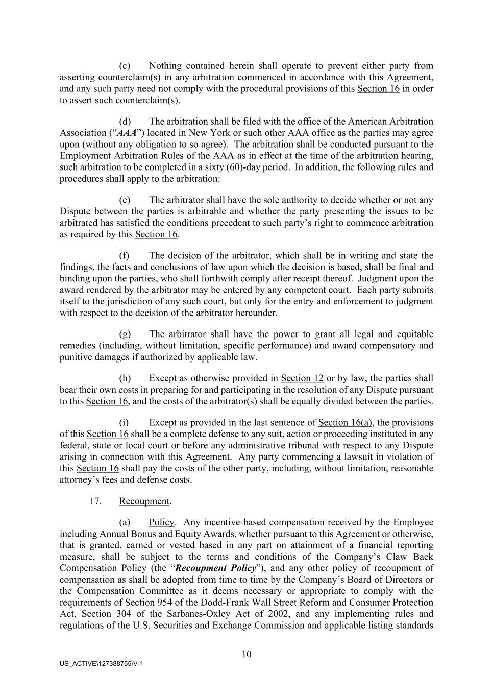 10 US _ ACTIVE \ 127388755 \ V-1(c)本文所载的任何内容均不得阻止任何一方在根据本协议启动的任何仲裁中主张反请求,任何此类一方无需遵守本第16条的程序规定即可主张此类反请求。(d)仲裁应提交给位于纽约的美国仲裁协会(“AAA”)办事处或双方可能同意的其他AAA办事处(没有任何义务这样同意)。仲裁应根据仲裁聆讯时生效的AAA的《雇佣仲裁规则》进行,该仲裁须在六十(60)天期限内完成。此外,仲裁还应适用以下规则和程序:(e)仲裁员应拥有唯一的权力来决定当事人之间的任何争议是否可仲裁,以及提出拟仲裁问题的当事人是否已满足本条第16款要求的该当事人启动仲裁权利的先决条件。(f)仲裁员的决定应为书面决定,并说明裁决所依据的调查结果、事实和法律结论,该决定应为最终决定,并对当事人具有约束力,当事人在收到后应立即遵守。任何主管法院均可对仲裁员作出的裁决作出判决。每一方当事人都服从任何此类法院的管辖权,但仅限于对仲裁员根据本协议作出的决定作出的判决的进入和执行。(g)仲裁员有权准予所有法律和衡平法补救办法(包括但不限于具体履行),并在适用法律授权的情况下判给补偿性和惩罚性损害赔偿。(h)除第12条或法律另有规定外,各方当事人应自行承担依据本条第16条准备和参与解决任何争议的费用,仲裁员的费用应由各方当事人平分。(i)除第16(a)条最后一句规定外,本第16条的规定应是对在任何联邦、州或地方法院或在任何行政法庭就与本协议有关的任何争议提起的任何诉讼、诉讼或程序的完整抗辩。任何一方当事人违反本第十六条规定提起诉讼,应当支付对方当事人的费用,包括但不限于合理的律师费、辩护费等。17.补偿。(a)政策。员工收到的任何基于激励的薪酬,包括年度奖金和股权奖励,无论是根据本协议还是其他方式,如果基于实现财务报告措施的任何部分被授予、赚取或归属,则应遵守公司追回补偿政策(“补偿政策”)的条款和条件,以及公司董事会或薪酬委员会认为为遵守《多德-弗兰克华尔街改革和消费者保护法》第954条、2002年《萨班斯-奥克斯利法案》第304条以及美国证券交易委员会的任何实施规则和条例以及适用的上市标准的要求而不时采取的任何其他补偿政策