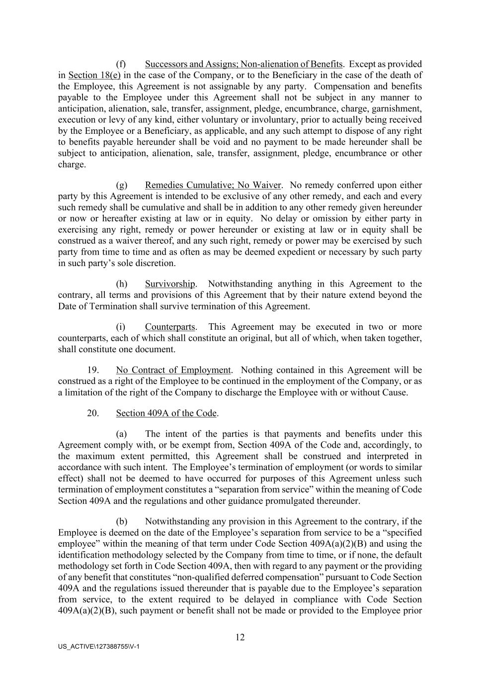 12 US _ active \ 127388755 \ v-1(f)继任者和受让人;利益不异化。除第18(e)条在公司的情况下或在雇员死亡的情况下向受益人规定外,本协议不可由任何一方转让。根据本协议应付给雇员的补偿和福利,在雇员或受益人(如适用)实际收到之前,不得以任何方式受到预期、转让、出售、转让、转让、质押、产权负担、押记、扣押、扣押、执行或任何形式的自愿或非自愿征款,任何此类试图处置根据本协议应付的任何福利权利的行为均应无效,且根据本协议支付的任何款项均不得受到预期、转让、出售、转让、转让、质押、产权负担或其他押记的影响。(g)累积补救办法;不放弃。本协议授予任何一方的任何补救措施均无意排除任何其他补救措施,每一项此类补救措施均应是累积性的,并应是对根据本协议或现在或以后在法律上或公平上存在的任何其他补救措施的补充。任何一方当事人在行使本协议项下或存在于法律上或权益上的任何权利、补救或权力时的任何延迟或不作为,均不得解释为对其放弃,而任何该等权利、补救或权力可由该当事人不时行使,并视其认为合宜或必要而由该当事人自行酌情行使。(h)遗属。尽管本协议中有任何相反的规定,本协议的所有条款和规定因其性质而延伸到终止日期之后,应在本协议终止后继续有效。(i)对应方。本协议可由两个或两个以上的对应方签署,每一方应构成一份正本,但全部合并后应构成一份文件。19.没有雇佣合同。本协议中的任何内容都不会被解释为雇员继续受雇于公司的权利,或被解释为限制公司有理由或无故解雇雇员的权利。20.守则第409a条。(a)各方的意图是,本协议项下的付款和利益符合或豁免于《守则》第409A条,因此,在允许的最大范围内,本协议应按照该意图进行解释和解释。就本协议而言,雇员终止雇用(或具有类似效果的词语)不应被视为已经发生,除非此种终止雇用构成《守则》第409A条以及据此颁布的条例和其他指南所指的“离职”。(b)尽管本协议中有任何相反的规定,如果雇员在离职之日被视为《守则》第409A(a)(2)(b)条规定的该词所指的“特定雇员”,并使用公司不时选择的识别方法,或者如果没有,则采用《守则》第409A条规定的默认方法,然后,对于根据《守则》第409A条及其下发布的条例构成因雇员离职而应支付的任何付款或提供的任何福利,在符合《守则》第409A(a)(2)(b)条要求延迟的范围内,不得事先向雇员支付或提供此类付款或福利