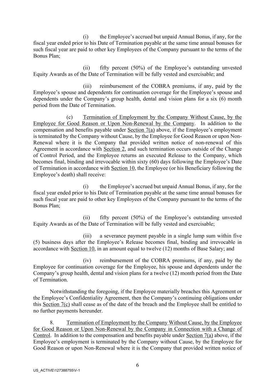 6 US _ ACTIVE \ 127388755 \ V-1(i)雇员在其终止日期前结束的财政年度的应计但未支付的年度奖金(如有)在该财政年度的年度奖金根据奖金计划的条款支付给公司其他关键雇员的同时支付;(ii)雇员截至终止日期未归属的未归属股权奖励的百分之五十(50%)将全部归属并可行使;(iii)补偿COBRA保费(如有),由雇员的配偶和受抚养人支付自终止之日起六(6)个月的公司团体健康、牙科和视力计划下雇员的配偶和受抚养人的延续保险。(c)公司无故终止雇用、雇员有正当理由终止雇用或公司不予续聘。除根据上文第7(a)条应付的补偿及福利外,如雇员的雇用由公司无故终止、由雇员有充分理由终止或在非续期时(如是公司根据第2条提供不续签本协议的书面通知,且该终止发生在控制权变更期之外,则雇员向公司退回已签立的解除通知,该解除通知在雇员根据第10条终止日期后六十(60)天内成为最终的、具有约束力和不可撤销的,雇员(或其在雇员去世后的受益人)应获得:(i)雇员应计但未支付的年度奖金(如有),根据奖金计划的条款向公司其他关键员工支付该财政年度的年度奖金,同时支付其终止日期之前结束的财政年度;(ii)截至终止日期,员工未归属的未归属股权奖励的百分之五十(50%)将完全归属并可行使;(iii)根据第10条,在员工的释放成为最终、具有约束力和不可撤销后的五(5)个工作日内一次性支付的遣散费,金额相当于十二(12)个月的基本工资;以及(iv)偿还雇员为公司团体健康、牙科和视力计划下的雇员、其配偶和受抚养人的持续保险而支付的COBRA保费(如有),自终止之日起十二(12)个月。尽管有上述规定,如果雇员实质上违反本协议或雇员的保密协议,则公司根据本条第7(c)款承担的持续义务自违约之日起终止,雇员无权再根据本协议获得付款。8.公司无故终止雇佣、员工有正当理由终止雇佣或公司因控制权变更不予续聘。除根据上文第7(a)条须支付的补偿及福利外,如雇员的雇用被公司无故终止、由雇员有充分理由终止或在非续任时(如是公司提供书面通知)