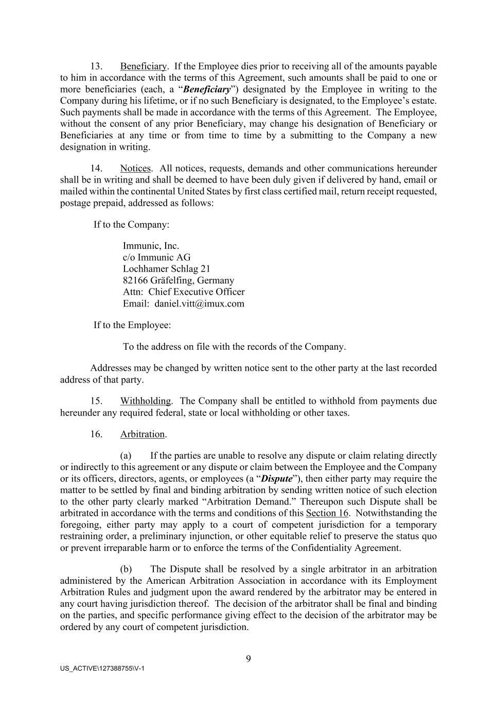 9 US _ active \ 127388755 \ v-1 13。受益者。如果雇员在收到根据本协议条款应支付给他的全部款项之前死亡,则该等款项应支付给雇员在其有生之年以书面形式向公司指定的一名或多名受益人(每名为“受益人”),或者如果没有指定该受益人,则支付给雇员的遗产。此类付款应按照本协议的条款进行。雇员在未经任何先前受益人同意的情况下,可随时或不时以书面向公司提交新的指定的方式更改其指定的受益人或受益人。14.通知。本协议项下的所有通知、请求、要求和其他通信均应以书面形式发出,如果以专人送达、电子邮件或在美国大陆范围内以头等挂号信方式邮寄、要求回执、预付邮资的方式送达,则应视为已妥为发出,地址如下:If to the company:Immunic,Inc. c/o Immunic AG Lochhamer Schlag 2182166 Gr ä felfing,Germany Attn:Chief Executive Officer Email:daniel.vitt@imux.com If to the employee:to the address on file with the company records。地址可以通过以对方最后记录的地址向对方发送书面通知的方式变更。15.扣留。公司有权根据任何规定的联邦、州或地方预扣税或其他税款从本协议项下到期的付款中预扣。16.仲裁。(a)如果双方无法解决与本协议直接或间接有关的任何争议或索赔,或雇员与公司或其高级职员、董事、代理人或雇员之间的任何争议或索赔(“争议”),则任何一方可要求通过最终且具有约束力的仲裁解决该事项,方法是向另一方发送明确标有“仲裁要求”的书面选择通知。因此,此种争议应根据本条第16款的条款和条件进行仲裁。尽管有上述规定,任何一方均可向有管辖权的法院申请临时限制令、初步禁令或其他衡平法上的救济,以维持现状或防止不可挽回的损害或强制执行保密协议的条款。(b)争议应由一名仲裁员在美国仲裁协会根据其《就业仲裁规则》管理的仲裁中解决,并且可以在具有其管辖权的任何法院对仲裁员作出的裁决作出判决。仲裁员的决定具有终局性,对当事人具有约束力,具体履行使仲裁员决定生效的,可以由任何有管辖权的法院下令执行。