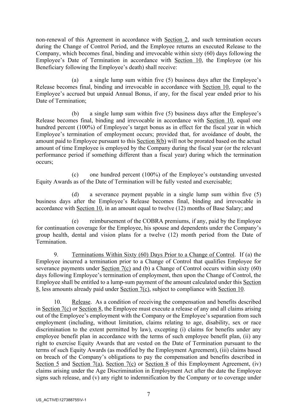 7 US _ ACTIVE \ 127388755 \ V-1未根据第2节续签本协议,且此类终止发生在控制权变更期间,且员工将已执行的解除通知退回公司,该解除通知在员工根据第10节终止日期后的六十(60)天内成为最终的、具有约束力和不可撤销的,员工(或其在员工死亡后的受益人)应收到:(a)在员工的解除通知成为最终的、具有约束力和根据第10节不可撤销的五(5)个工作日内一次性支付一笔款项,相当于员工应计但未支付的年度奖金(如有),(b)在雇员的释放成为根据第10条具有约束力和不可撤销的最终结果后的五(5)个工作日内,一次性支付一笔款项,相当于雇员终止雇用发生的财政年度有效的目标奖金的百分之百(100%);但为免生疑问,根据本条第8款(b)项支付予雇员的金额,将不会根据雇员在终止发生的财政年度(或有关业绩期间,如有别于某一财政年度)期间受雇于公司的实际时间按比例分配;(c)截至终止日期,雇员未归属的未归属股权奖励的百分之百(100%)将全部归属并可行使;(d)在雇员的释放成为最终决定后的五(5)个工作日内一次性支付的遣散费,根据第10条具有约束力且不可撤销,金额相当于十二(12)个月的基本工资;(e)偿还雇员为公司团体健康、牙科和视力计划下的雇员、其配偶和受抚养人的延续保险而支付的COBRA保费(如有),自终止之日起十二(12)个月。9.控制权变更前六十(60)天内终止。如果(a)雇员在控制权变更之前发生了终止,使雇员有资格根据第7(c)和(b)条获得遣散费,则在雇员终止雇用后六十(60)天内发生控制权变更,则在控制权变更时,雇员有权获得根据本条第8款计算的金额减去已根据第7(c)条支付的金额的一次总付,但须遵守第10条。10.发布。作为获得第7(c)节或第8节中所述补偿和福利的条件,雇员必须执行解除因雇员受雇于公司或雇员与该雇员离职而产生的任何和所有索赔(包括但不限于在法律允许的范围内与年龄、残疾、性别或种族歧视有关的索赔),但(i)根据该雇员福利计划的条款对任何雇员福利计划下的福利索赔除外,(ii)根据该等股权奖励(经雇佣协议修订)的条款在终止日期归属的任何行使股权奖励的权利,(iii)基于违反公司支付本雇佣协议第5条和第7(a)条、第7(c)条或第8条所述补偿和福利的义务而提出的索赔,(iv)在雇员签署该释放日期后根据《就业年龄歧视法》产生的索赔,以及(v)公司获得赔偿或根据